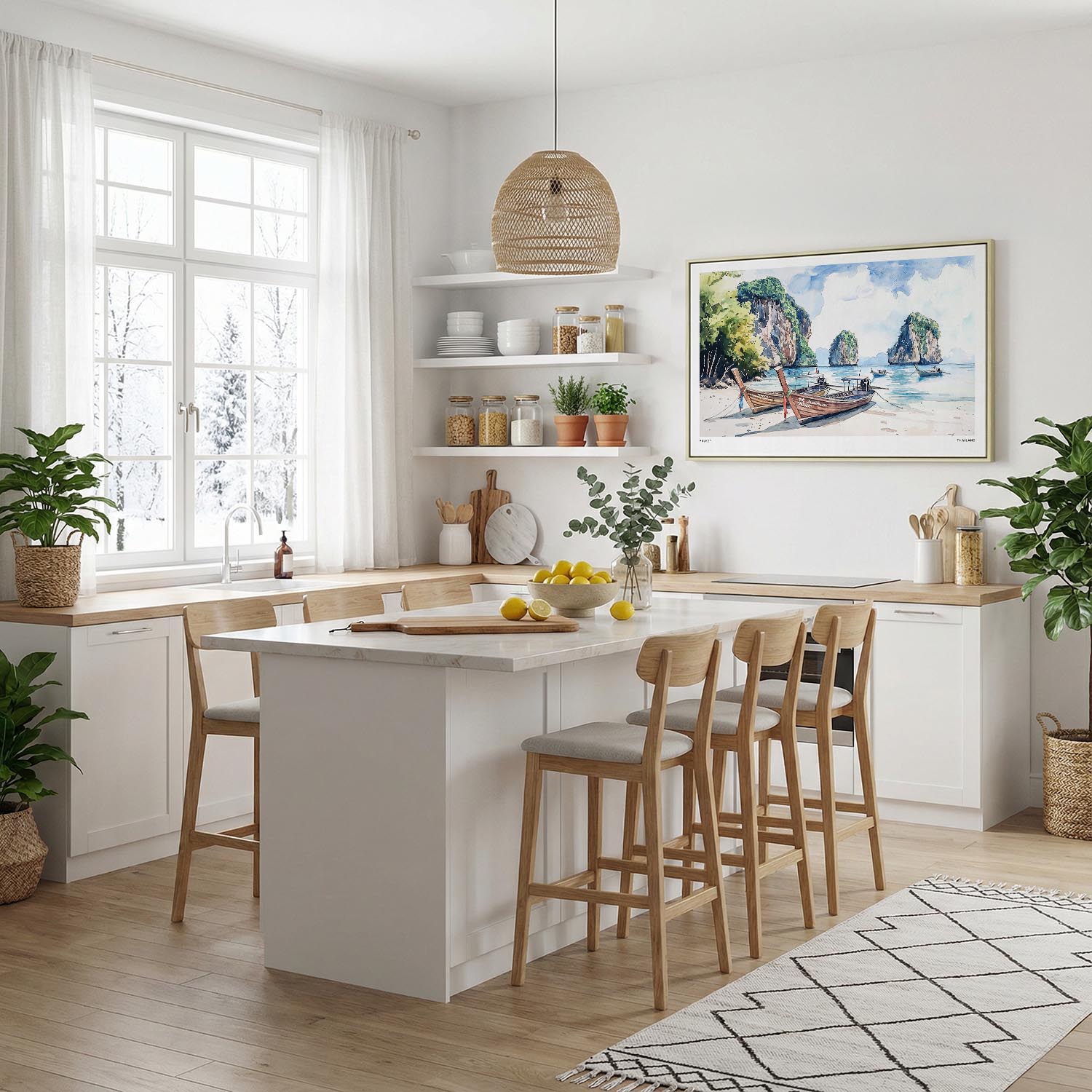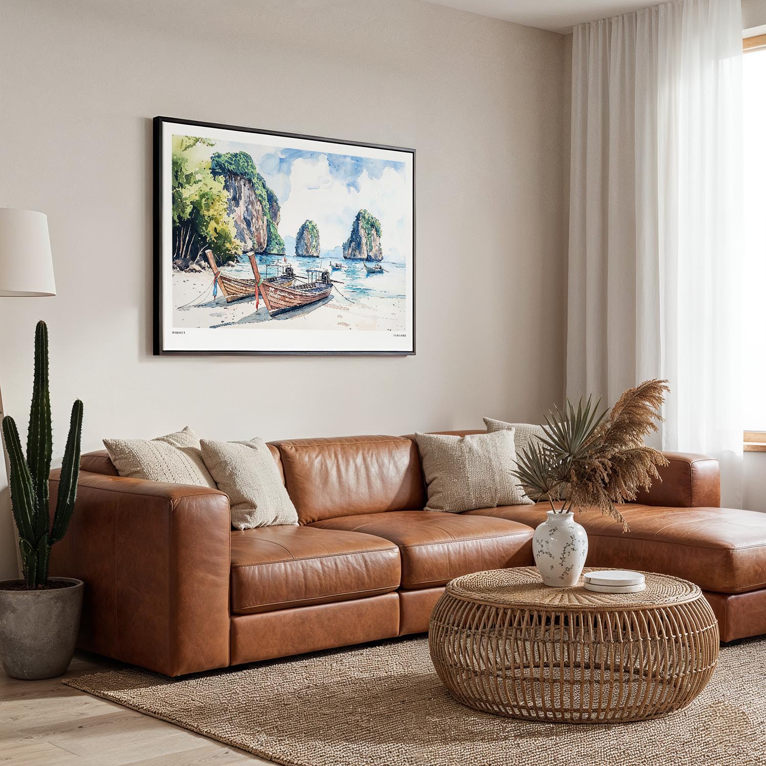 This canvas print captures the idyllic shores of Phuket, showcasing graceful longtail boats dotted along the tranquil beach. The soft blues and earthy greens reflect the calm atmosphere of Thailand’s stunning coastline, bringing a warm sense of escape into your home.