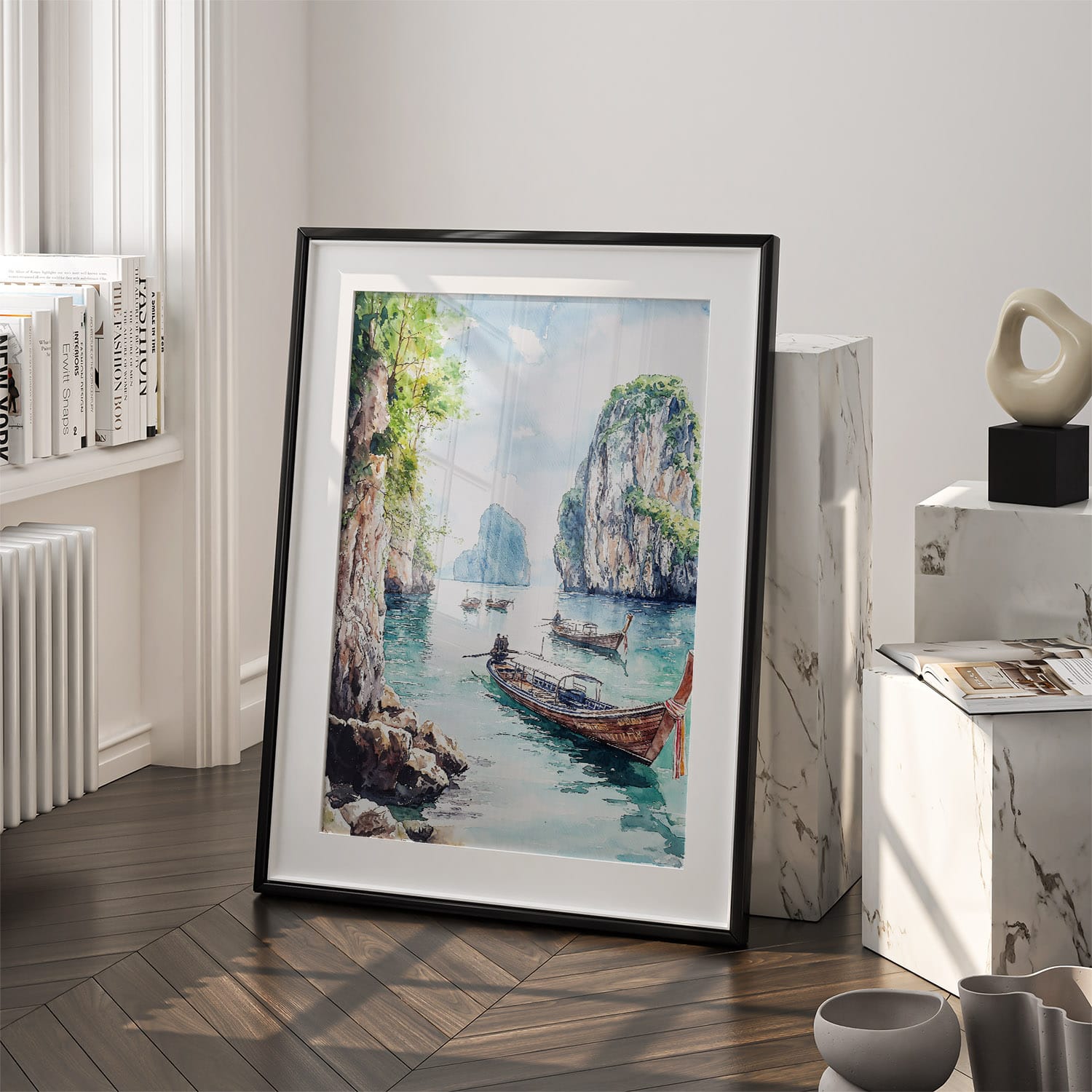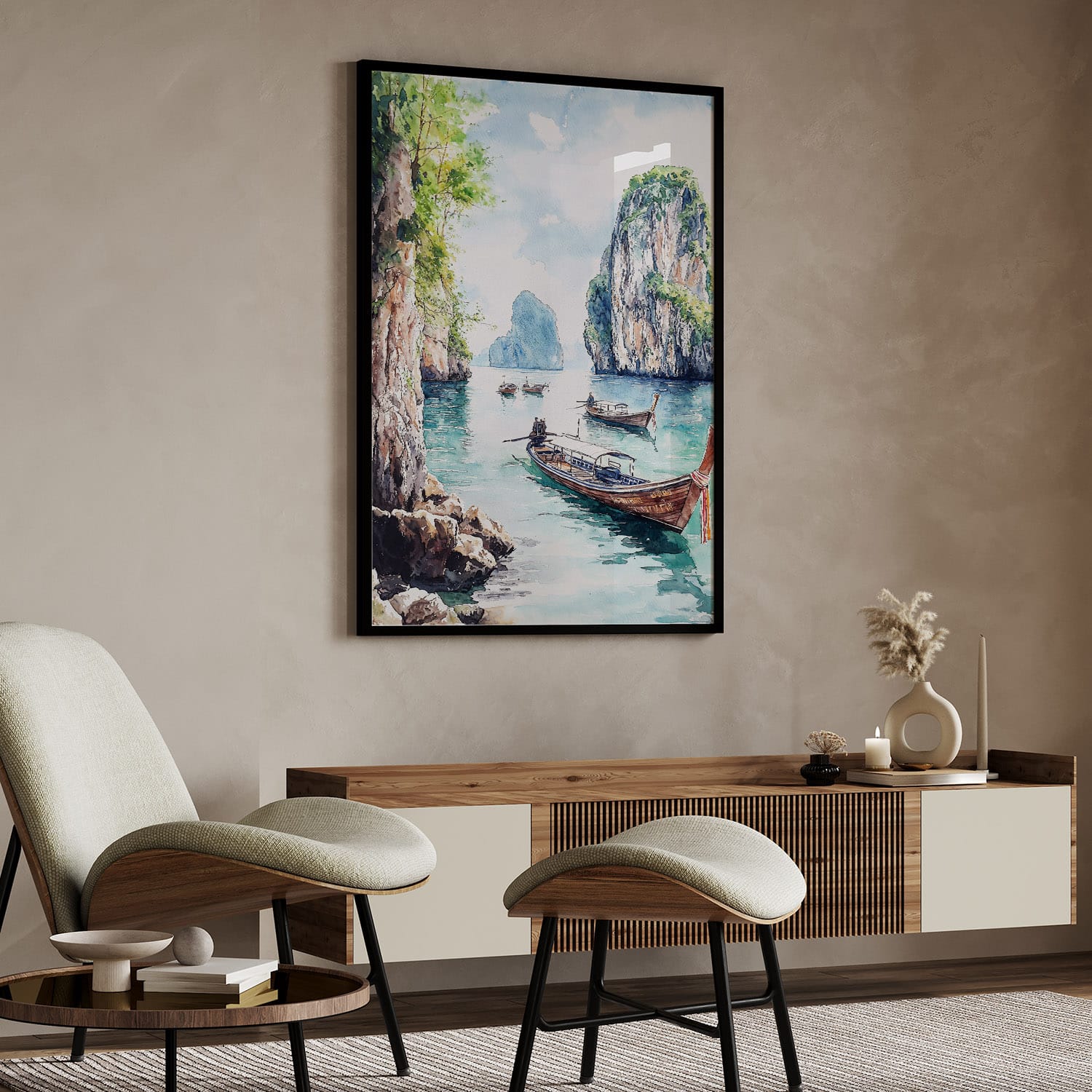 This artwork beautifully captures the serene coastal scenery of Phuket, showcasing clear blue waters and majestic limestone cliffs. The piece creates a relaxing atmosphere, perfect for decorating your living room, bedroom, or office. Available as a high-resolution digital file, it can be printed in various sizes at home or through a local print shop. Enjoy the simplicity and flexibility of instant access, allowing you to enhance your space or share with friends who love travel and nature.