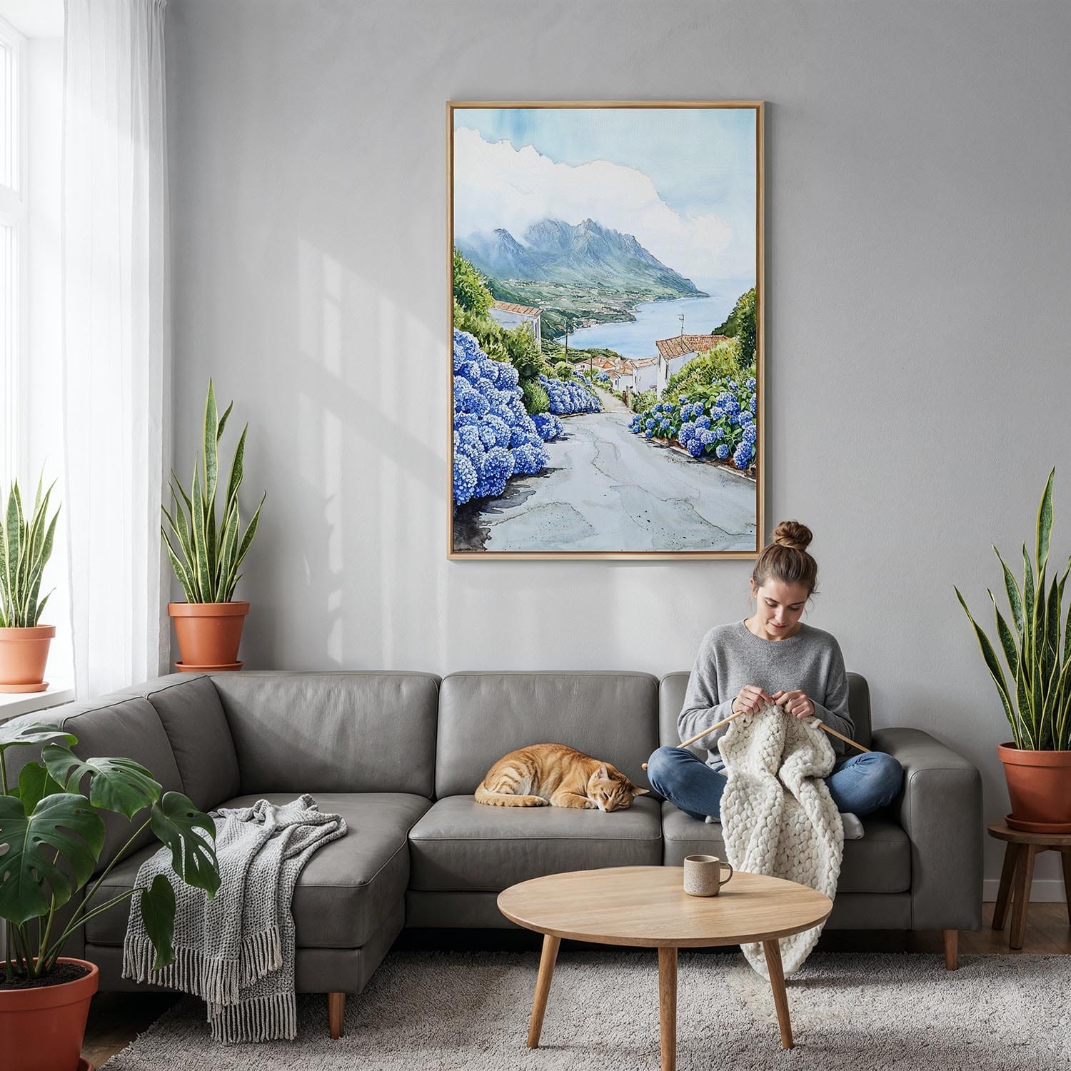 Experience the stunning beauty of Pico Island through this captivating canvas print. It captures the vibrant coastal landscape, showcasing lush blue hydrangeas against a backdrop of distant mountains and the shimmering sea. The watercolor style invites a sense of tranquility and connection to nature.