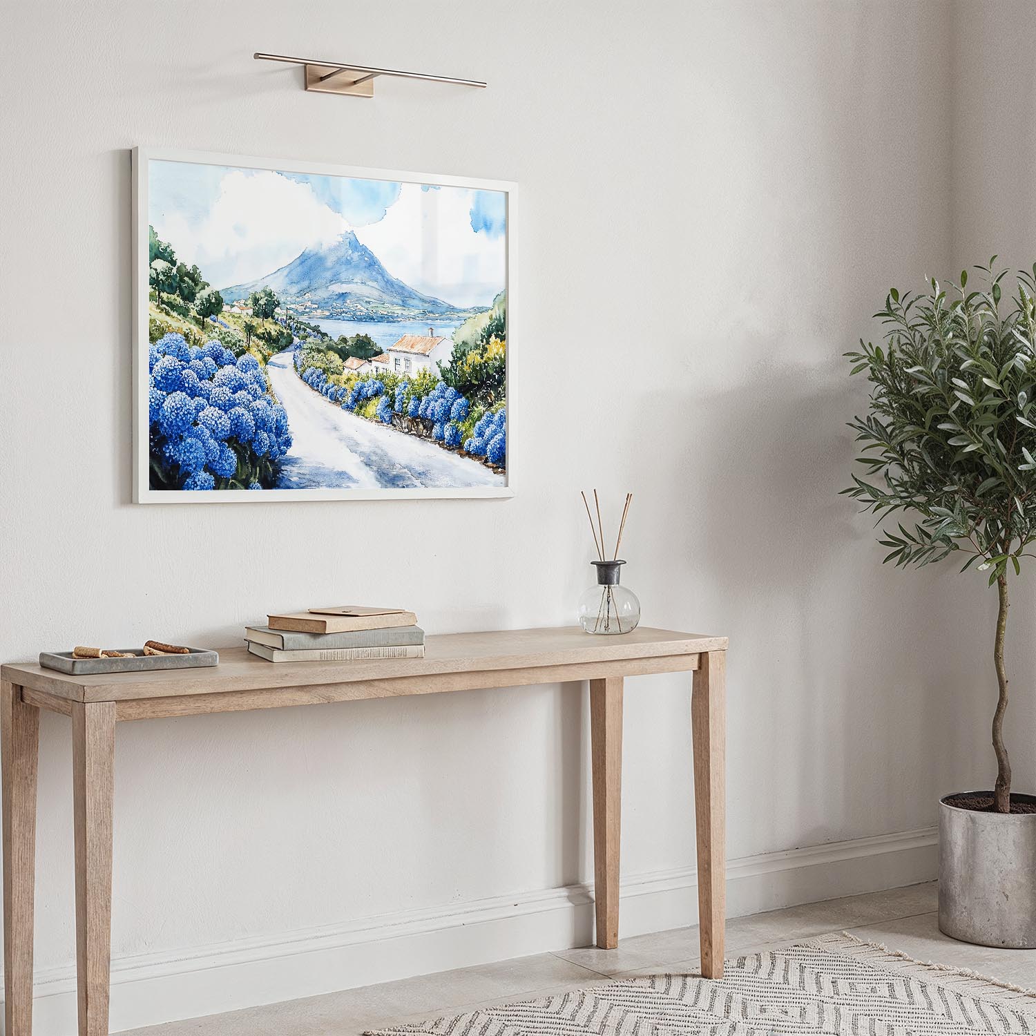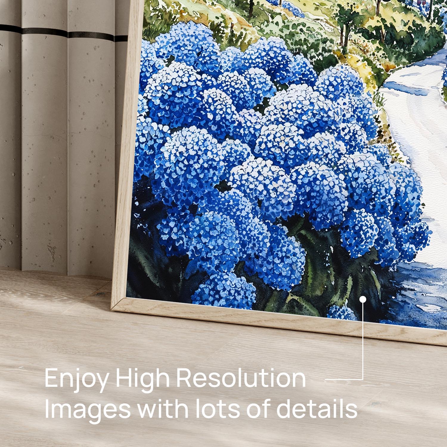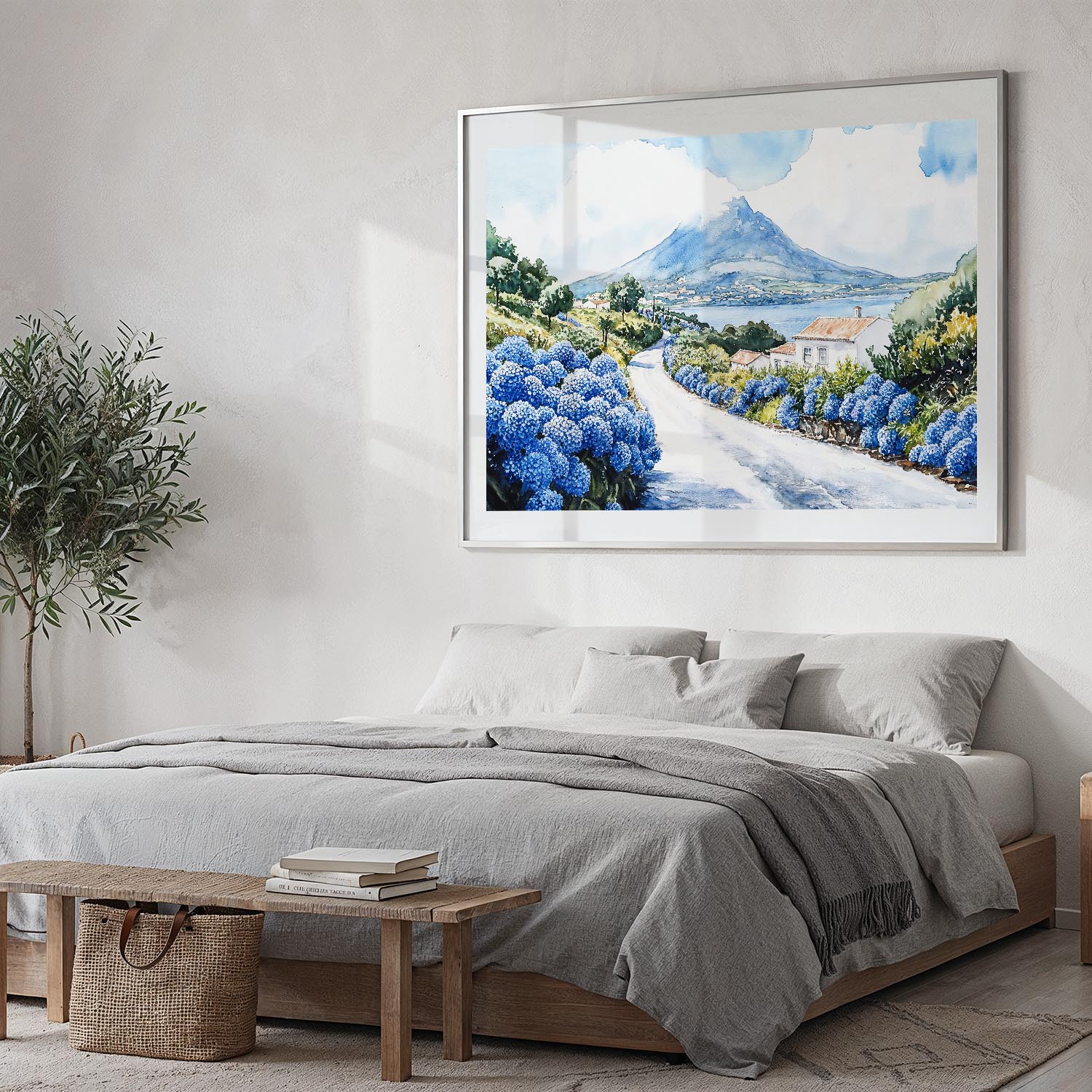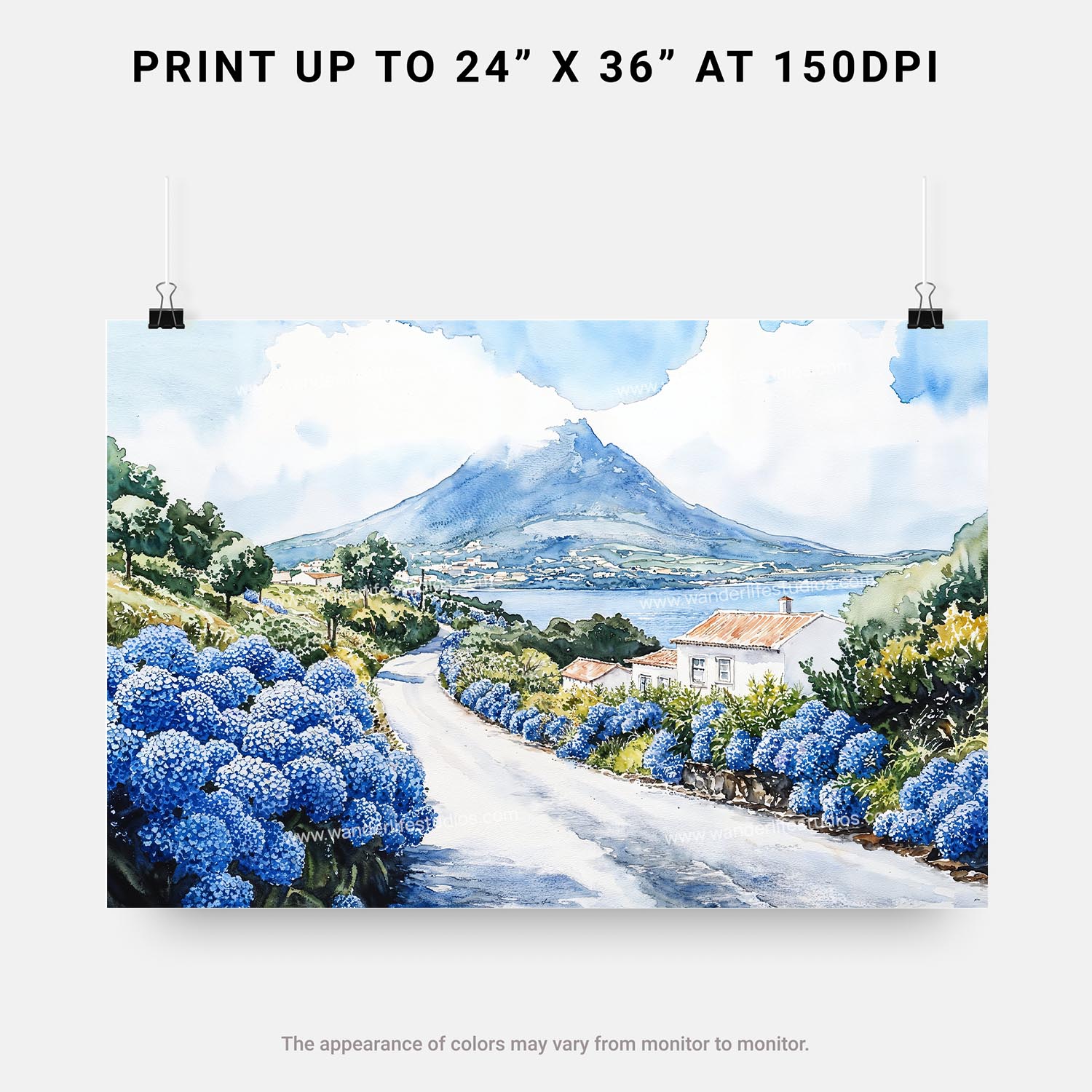 This artwork showcases the stunning coastal landscape of Pico Island, Portugal. With blooming blue flowers lining a winding road and majestic mountains in the background, the scene embodies the serene beauty of island life.