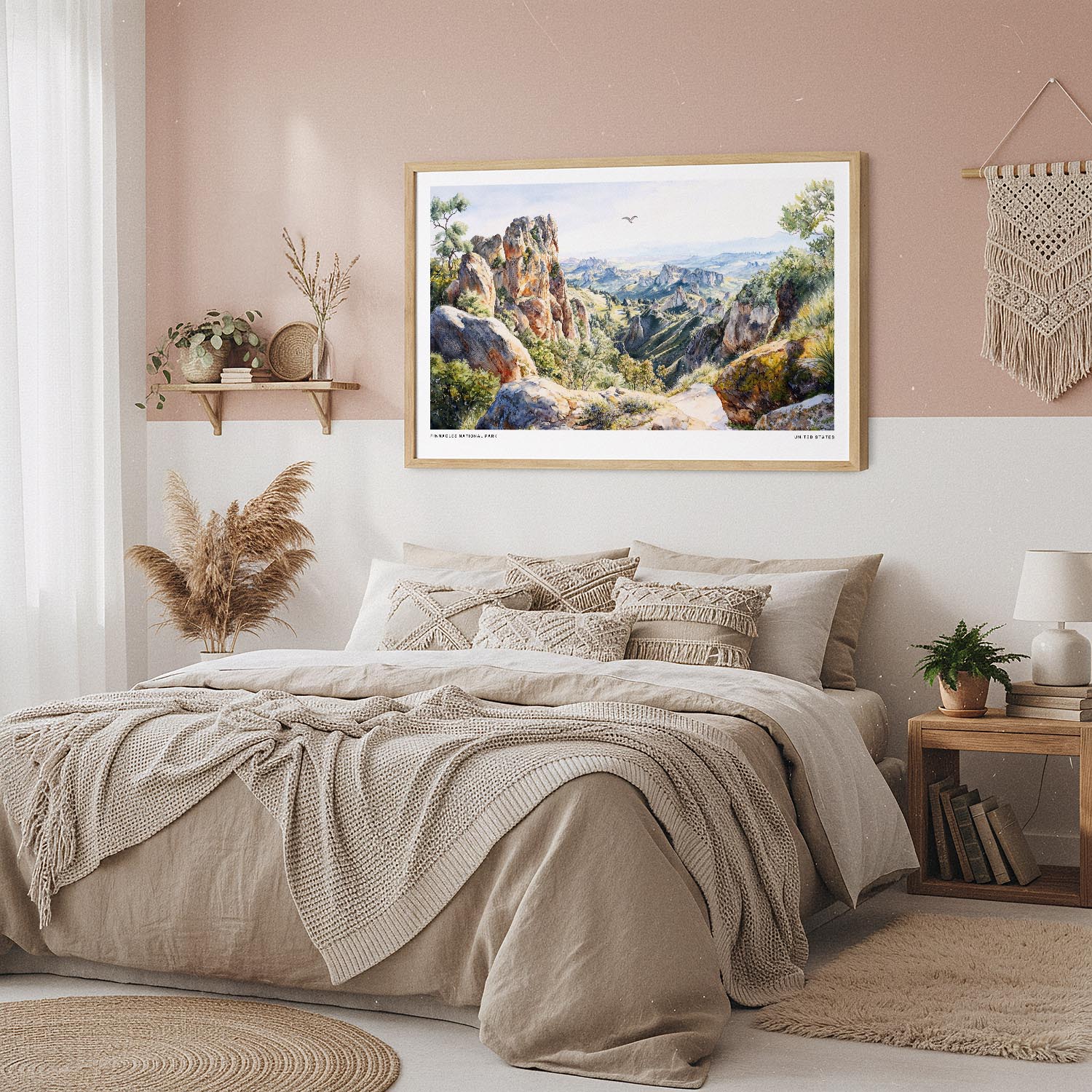 Experience the stunning beauty of Pinnacles National Park with this watercolor art print. Featuring rocky formations and rolling hills, it’s a wonderful addition for nature lovers and travel enthusiasts.