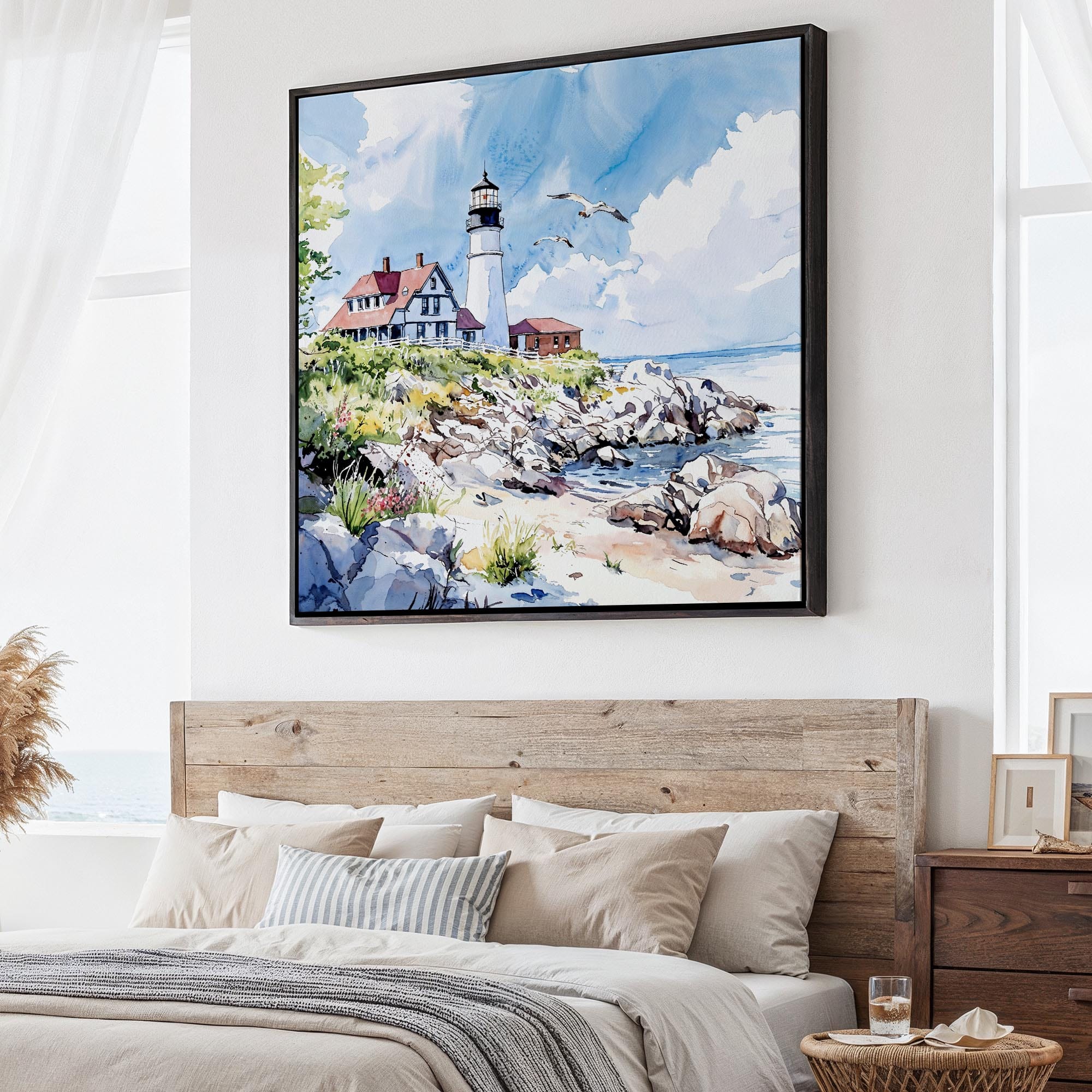 Portland Head Light Canvas Print | Maine Coastal Lighthouse Wall Art in Watercolor Style