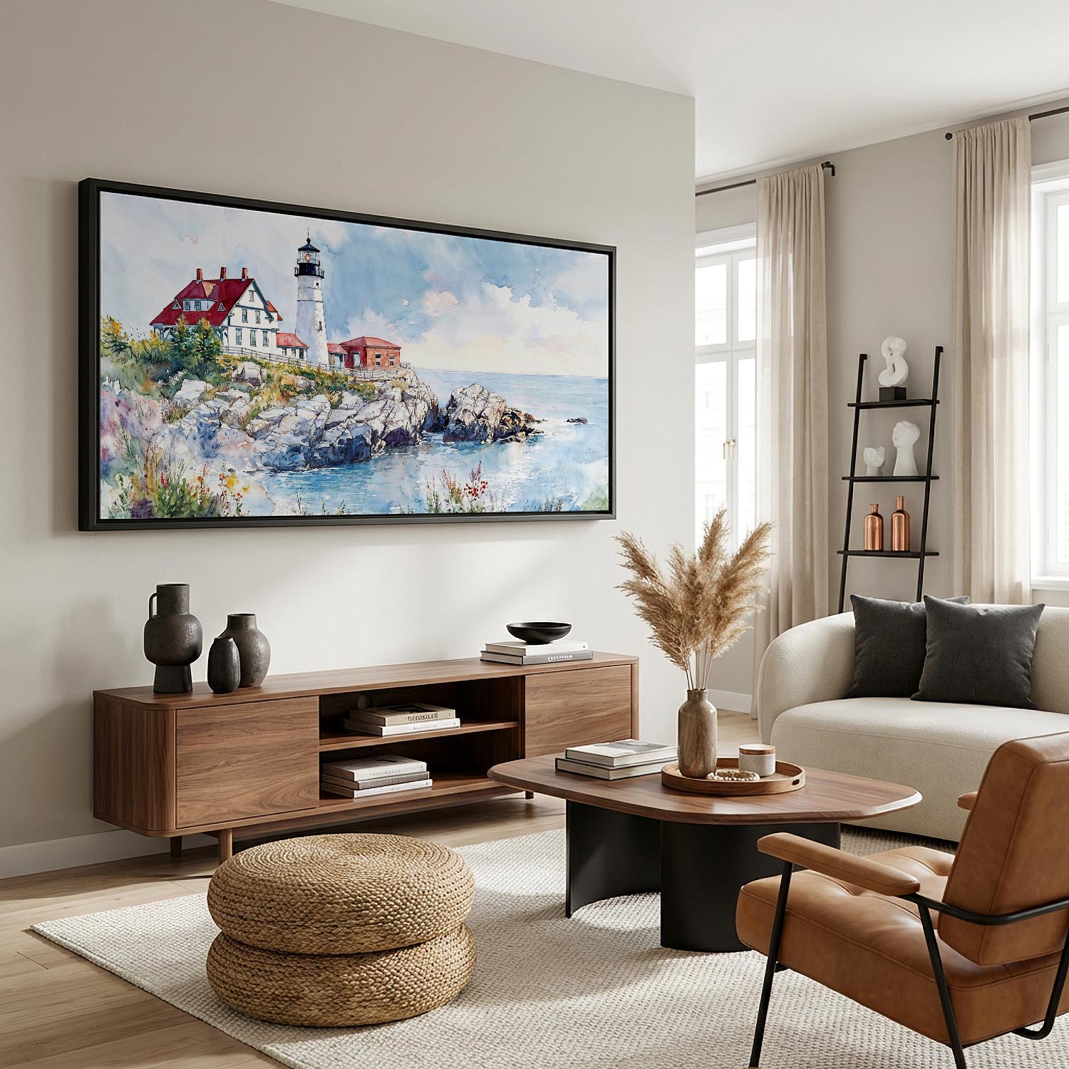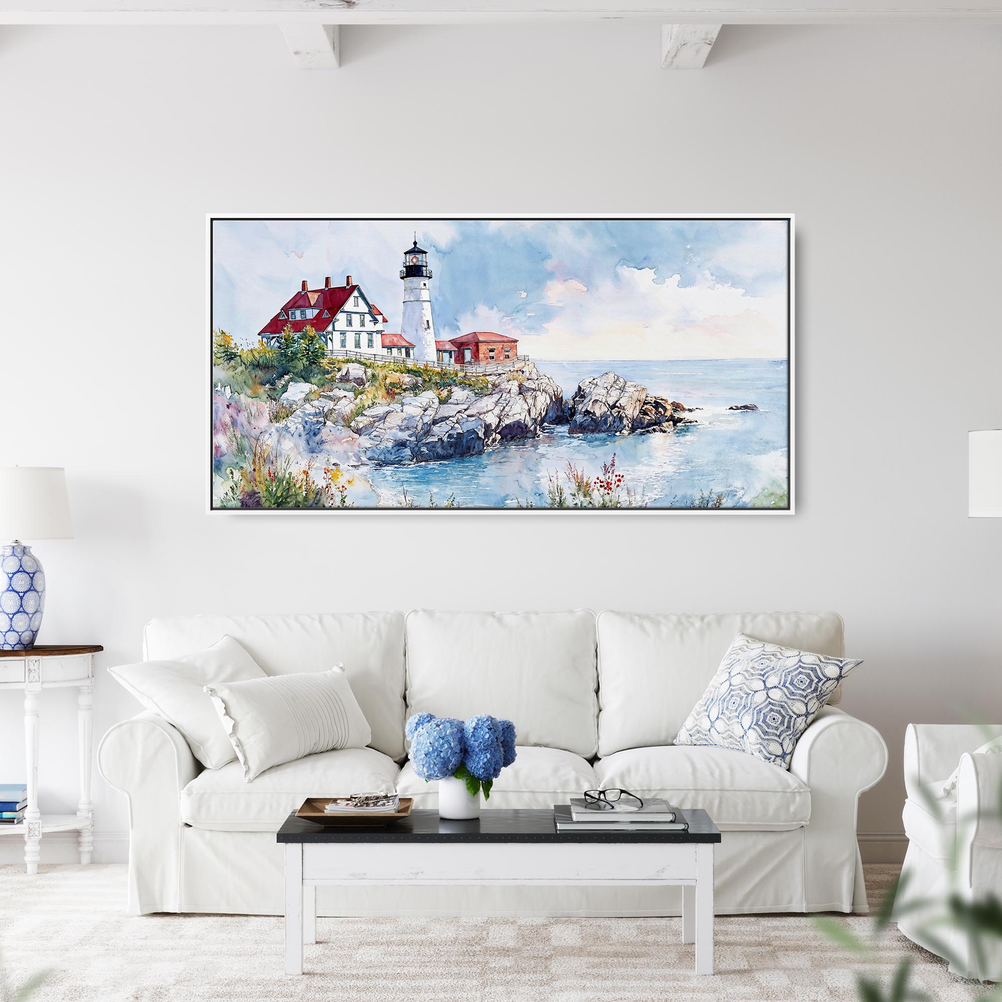 This canvas print captures the iconic Portland lighthouse with its vibrant coastal scenery, offering a glimpse of Maine’s rugged coastline. The wide 2:1 aspect ratio enhances the room’s feel, creating a sense of openness and tranquility. Crafted in the US from durable hand-stretched canvas using fade-resistant inks and finished with a matte coat, it arrives ready to hang. This artwork looks stunning above sofas or in hallways, providing a nautical touch to your decor. A thoughtful choice for personal enjoyment or as a gift for those who love coastal charm.