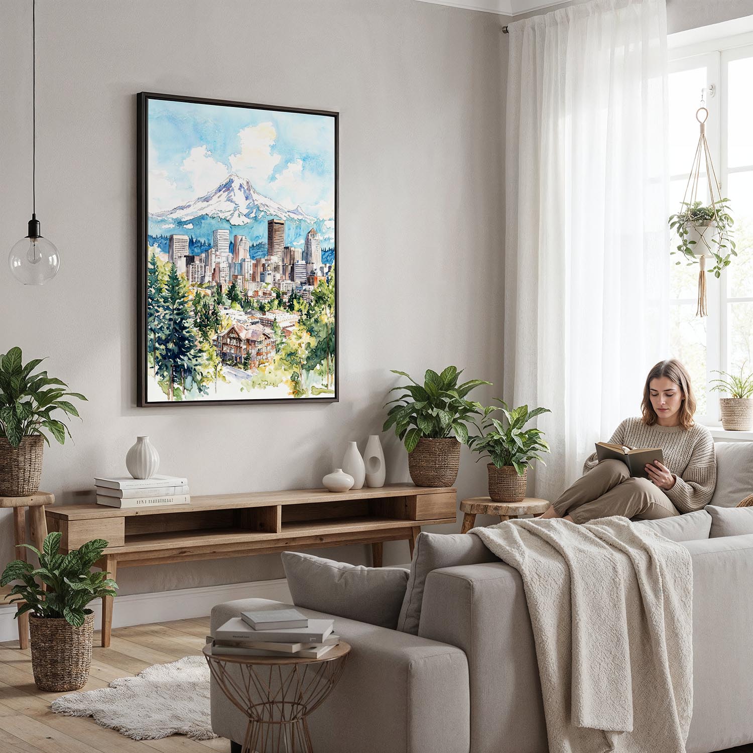 Portland Oregon Watercolor Canvas Print – Vibrant Cityscape Art