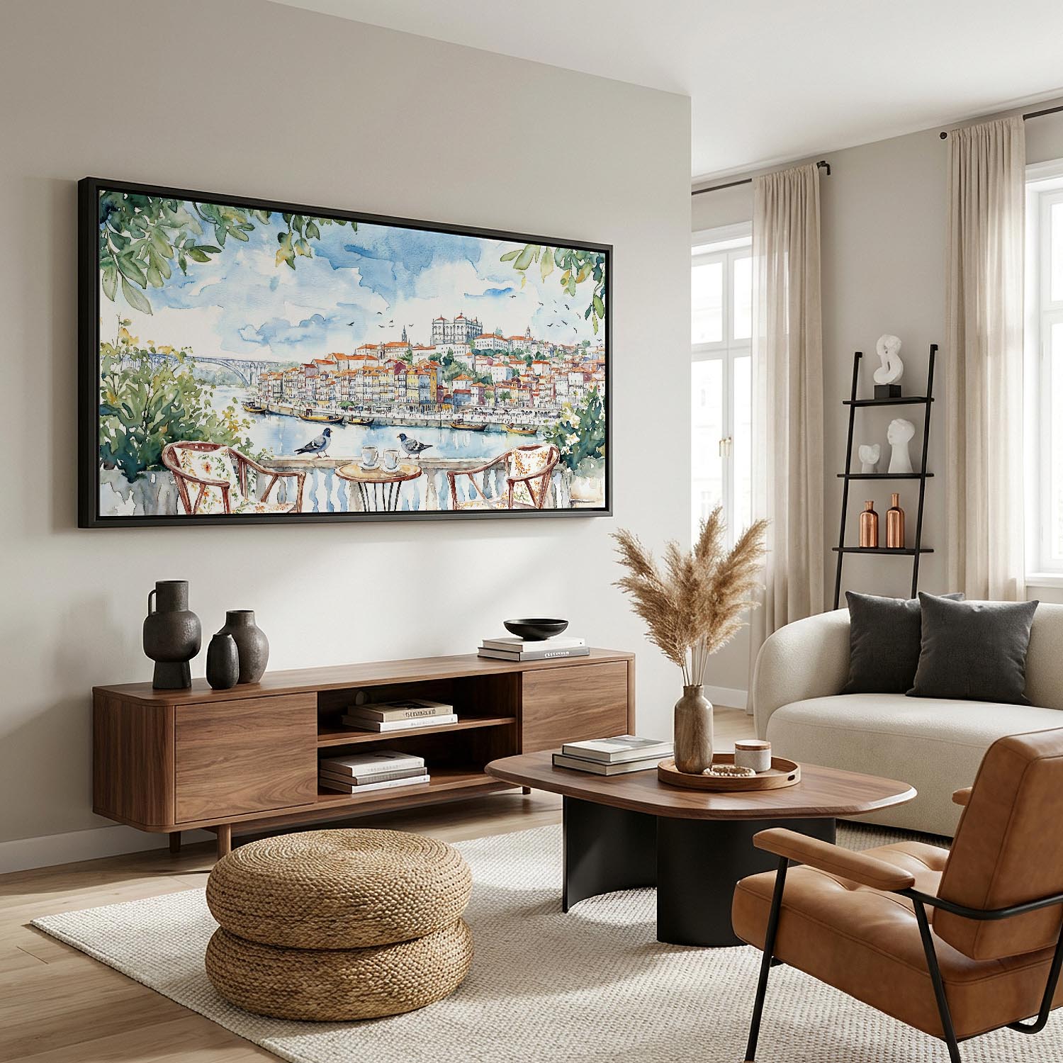 Capture the essence of Porto with this vibrant panorama canvas print, featuring colorful buildings lining the waterfront viewed from a quaint balcony. The 2:1 aspect ratio enhances the spaciousness of your room, making it feel open and inviting. Crafted from hand-stretched canvas and printed with fade-resistant inks, it offers durability along with a matte finish, arriving ready to hang on solid wood stretcher bars. This artwork is perfect for display above sofas, in hallways, or in modern offices. Enjoy it in your own space or share it as a thoughtful gift for those who appreciate charming cityscapes.