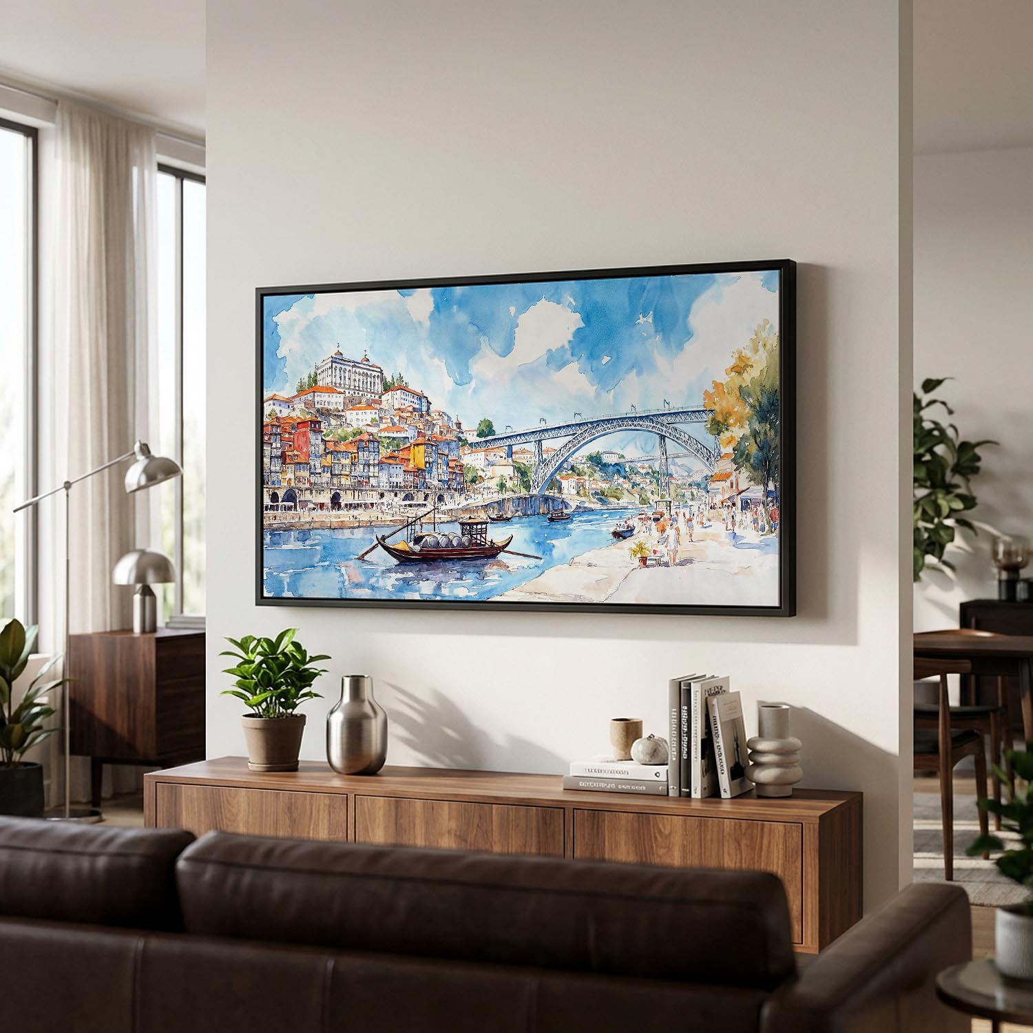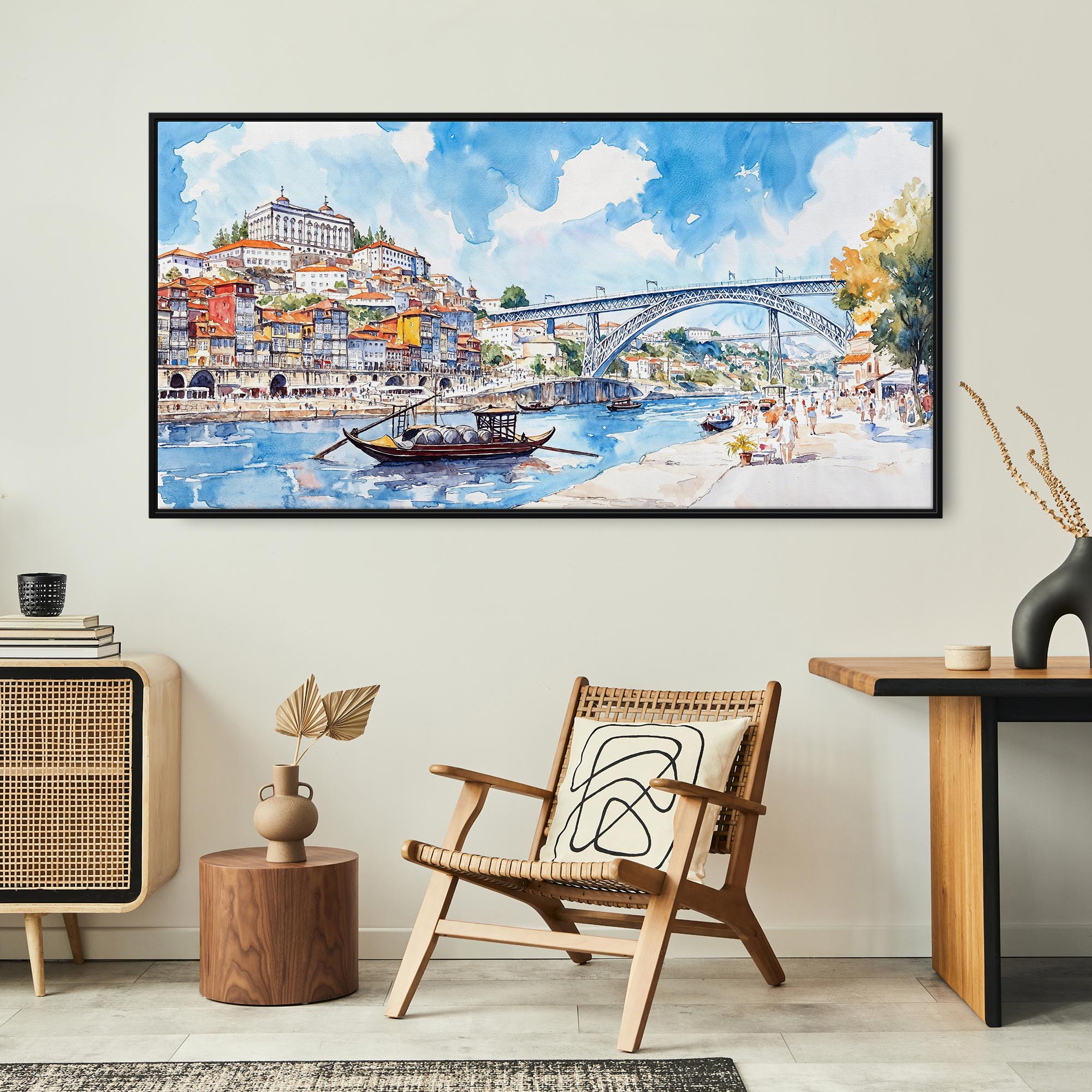 Porto Ribeira Panorama Canvas Print | Colorful Watercolor River Scene with Floater Frame