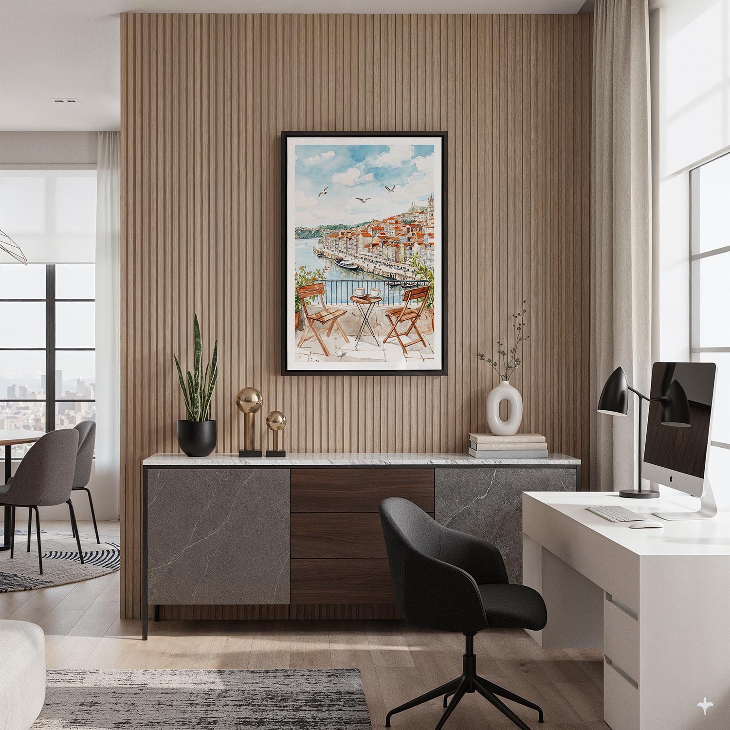 This canvas print captures the enchanting riverside scene of Porto, where two coffee mugs invite moments of relaxation. The vibrant colors and gentle brushstrokes evoke a warm and inviting atmosphere. Crafted on premium canvas with fade-resistant inks and solid wood stretcher bars, it arrives ready to hang in your favorite space. Ideal for a living room, kitchen, or cozy nook, it also makes a thoughtful gift for lovers of travel and culture.
