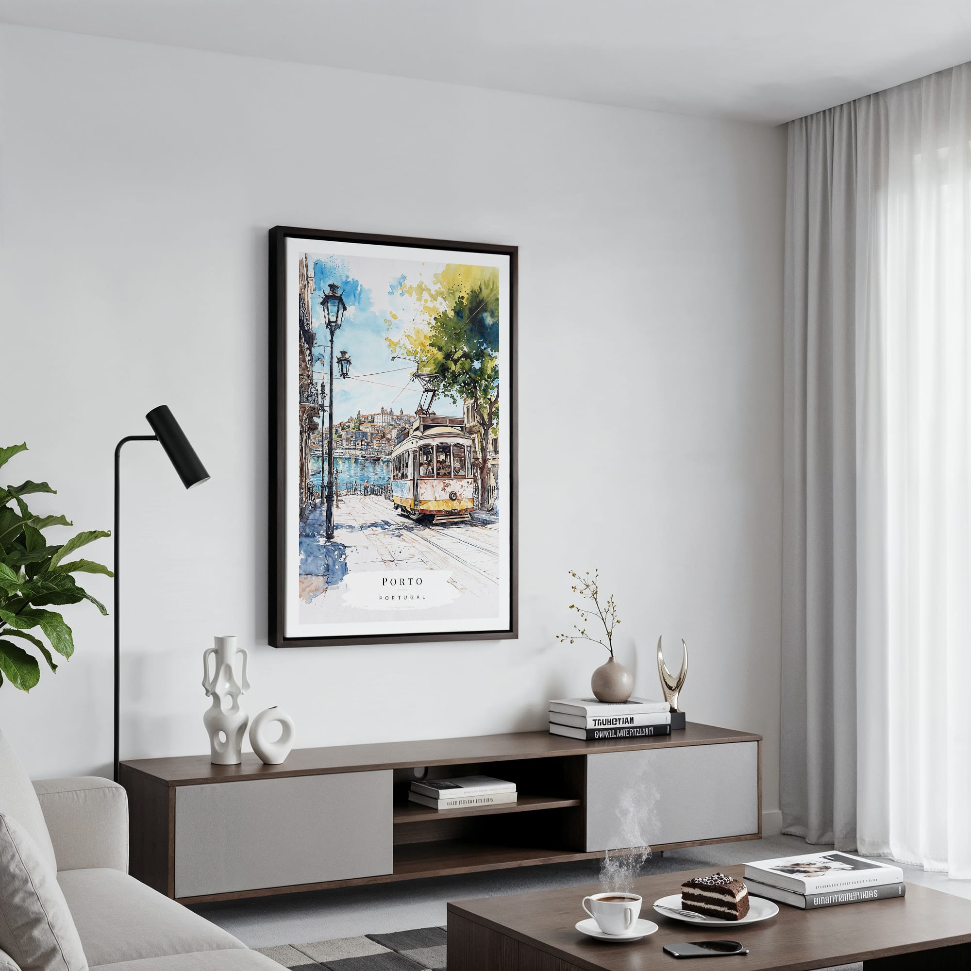 Porto Watercolor Canvas Art Print – Charming Tram Scene from Portugal