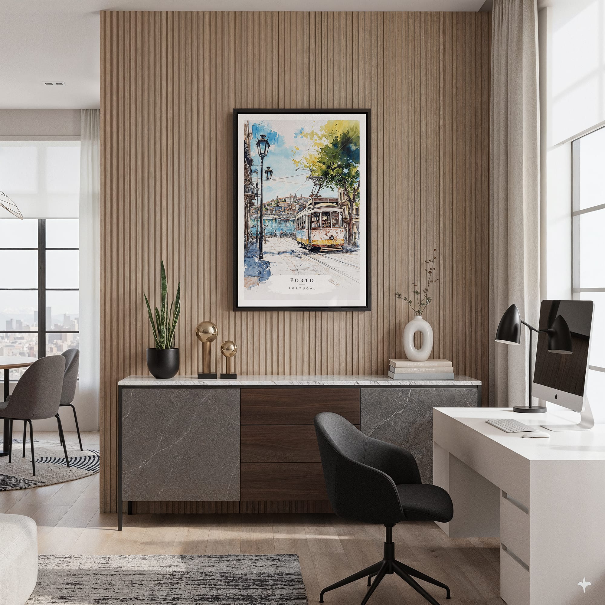 This artwork showcases a lively tram gliding through the streets of Porto, bathed in warm colors that evoke the essence of Portugal. The blend of blues and greens creates a relaxed atmosphere, making it perfect for enhancing your home or office. Printed on a quality canvas with fade-resistant inks, it’s ready to hang and fits harmoniously in living rooms, bedrooms, or workspaces. A meaningful piece to enjoy or share with those who love to explore.