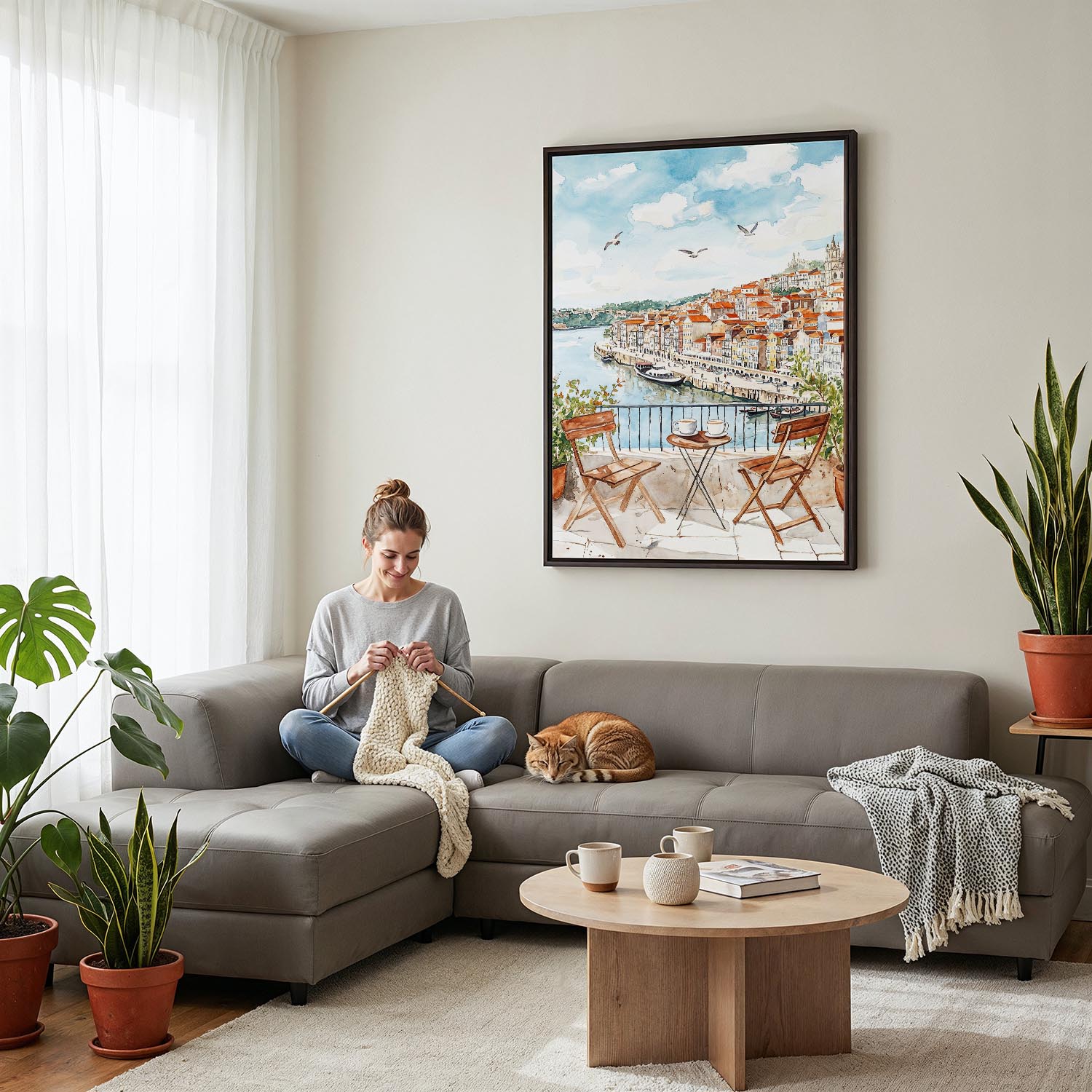 Enjoy the charm of Porto with this watercolor canvas print featuring a cozy morning scene by the river. This ready-to-hang piece is perfect for brightening up living rooms, kitchens, or home offices.