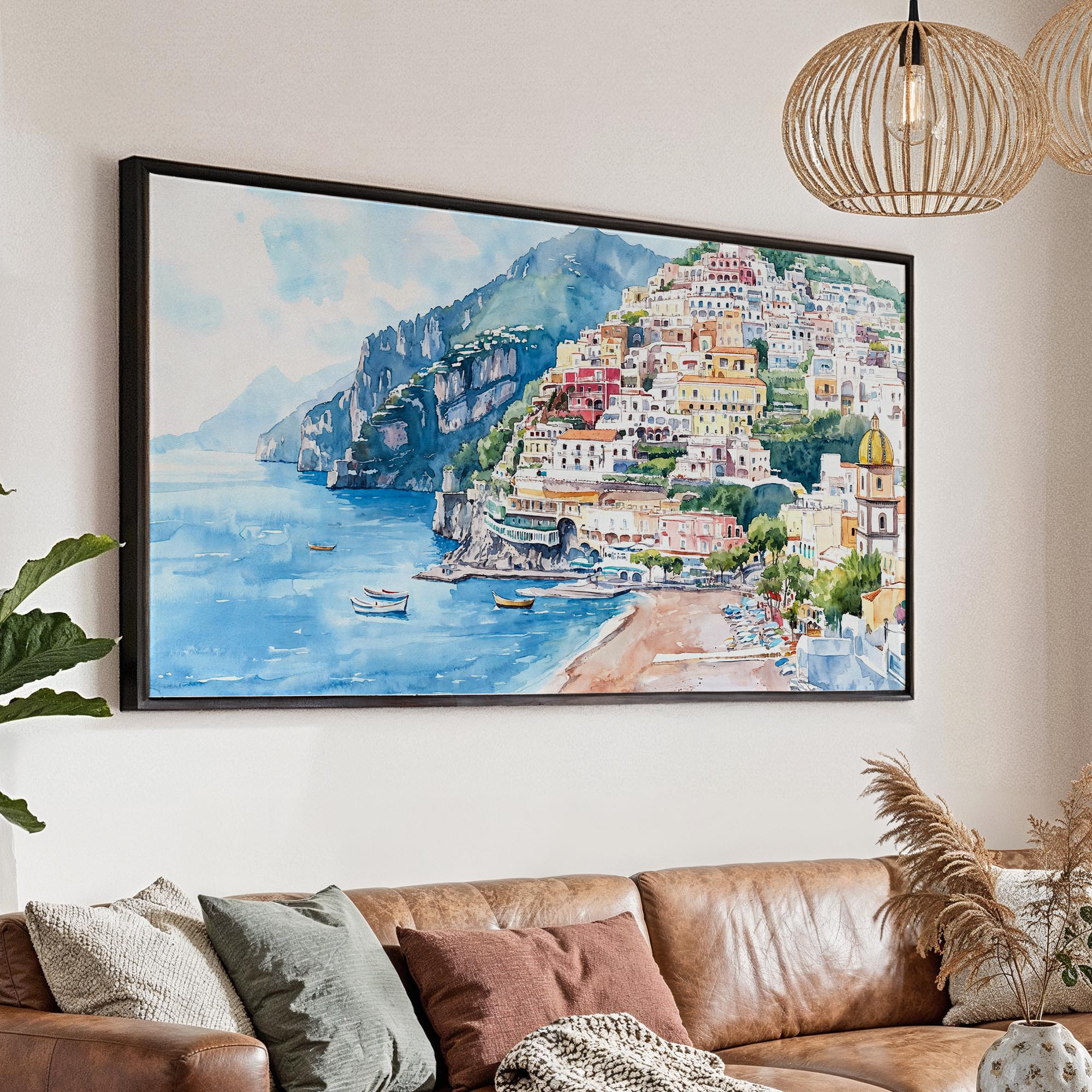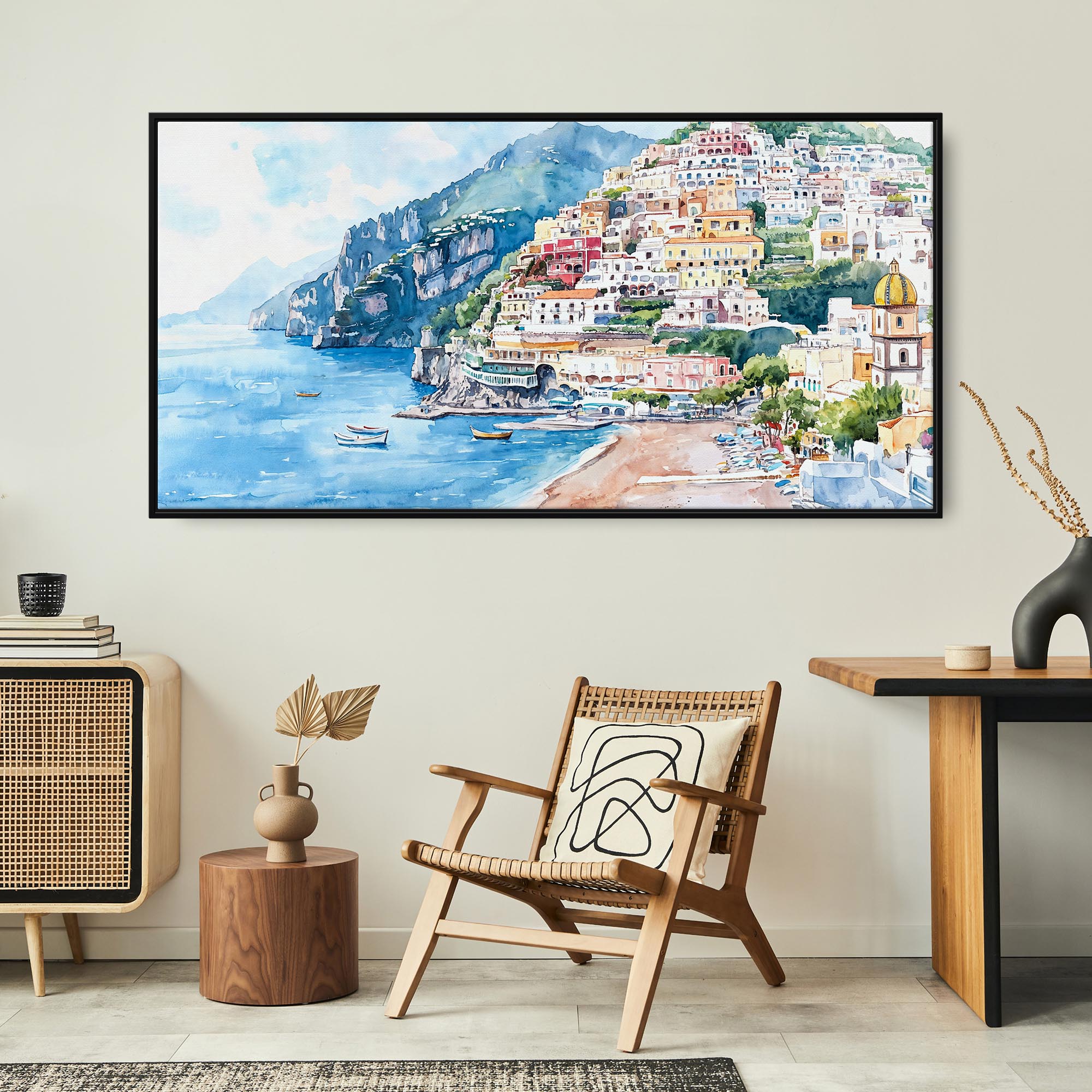 Positano Amalfi Coast Panorama Canvas Print – Vibrant Watercolor Style Wall Art
