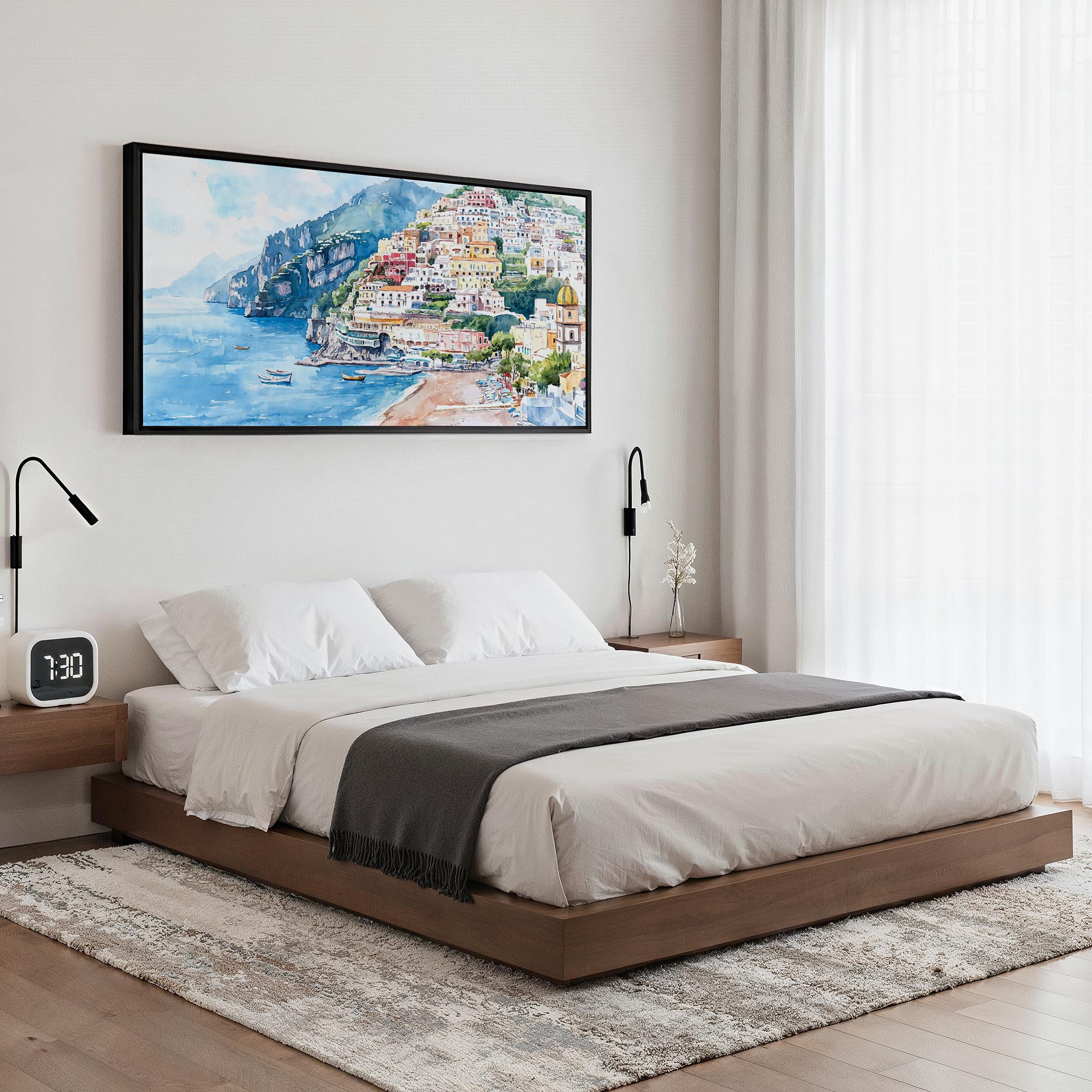 This piece captures the enchanting charm of Positano on the Amalfi Coast, with colorful homes cascading down rocky hillsides towards a serene sea. The panoramic width beautifully enhances aspects of the coastline, bringing a vibrant sense of life to your space. Crafted on premium hand-stretched canvas with fade-resistant inks and solid wood stretcher bars, it’s ready to hang and designed with care for sustainability. Perfect for above a sofa, in a cozy hallway, or in a stylish office. A wonderful choice for adding character to your home or as a thoughtful gift for lovers of coastal beauty.