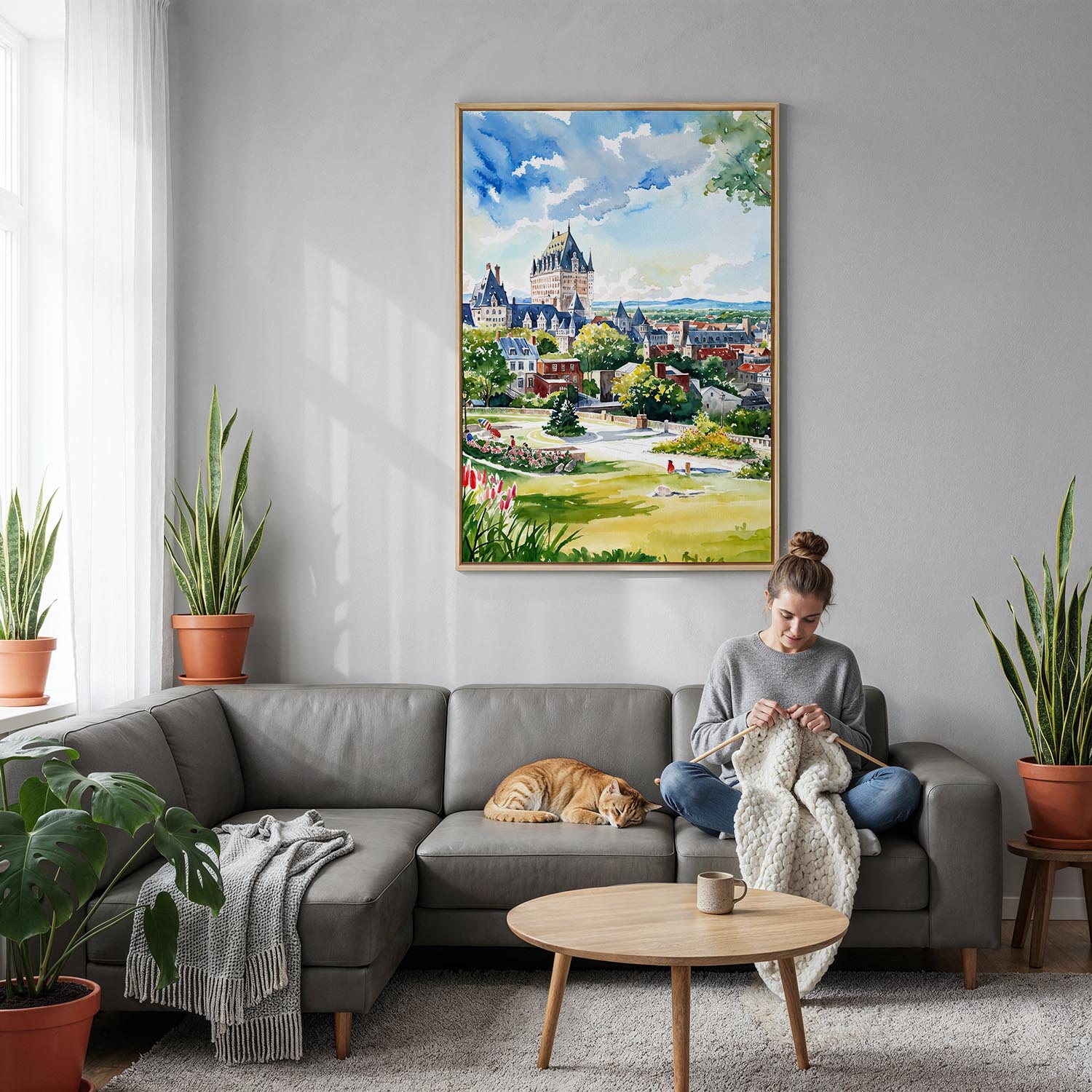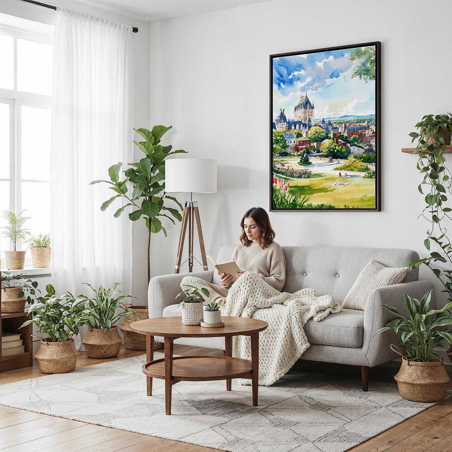 Bring a touch of Quebec’s charm into your home with this watercolor canvas print featuring the iconic Chateau Frontenac. Perfect for living rooms or offices, it arrives ready to hang for easy decoration.
