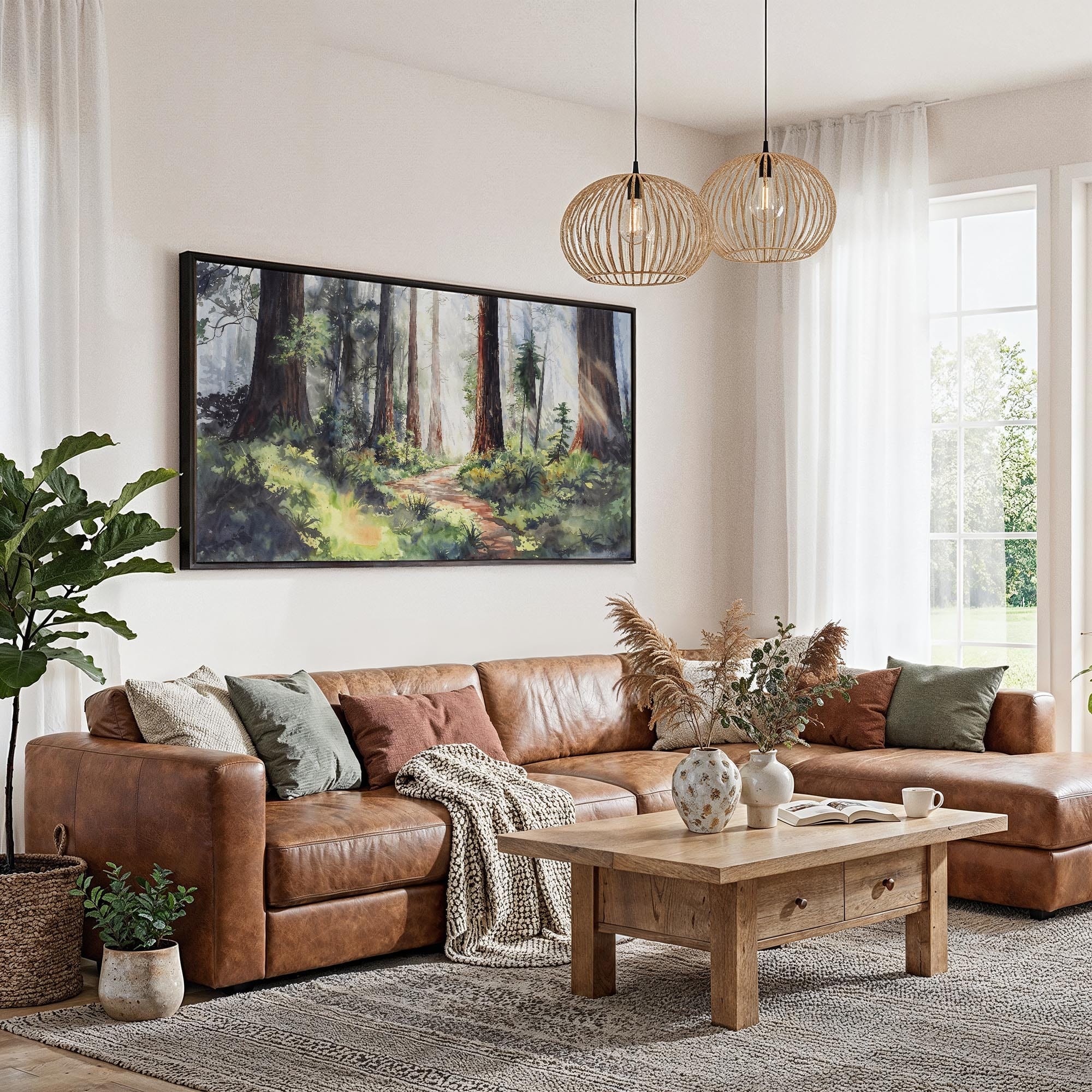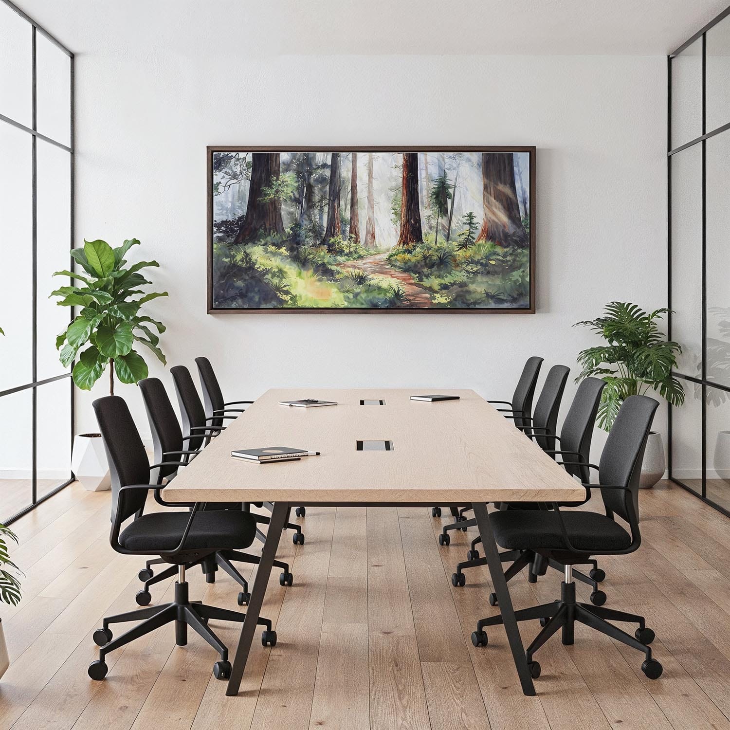 This artwork captures the enchanting essence of Redwood National Park, showcasing a peaceful forest trail surrounded by towering trees and dappled sunlight. The expansive 2:1 panoramic format instantly elevates the atmosphere of any space, providing a sense of openness and calm. Crafted from hand-stretched canvas with fade-resistant inks and solid wood stretcher bars, this piece is ready to hang and made sustainably in the US. Perfect for display above a sofa, in hallways, or in office spaces, it serves as a thoughtful gift or a soothing piece for personal enjoyment.