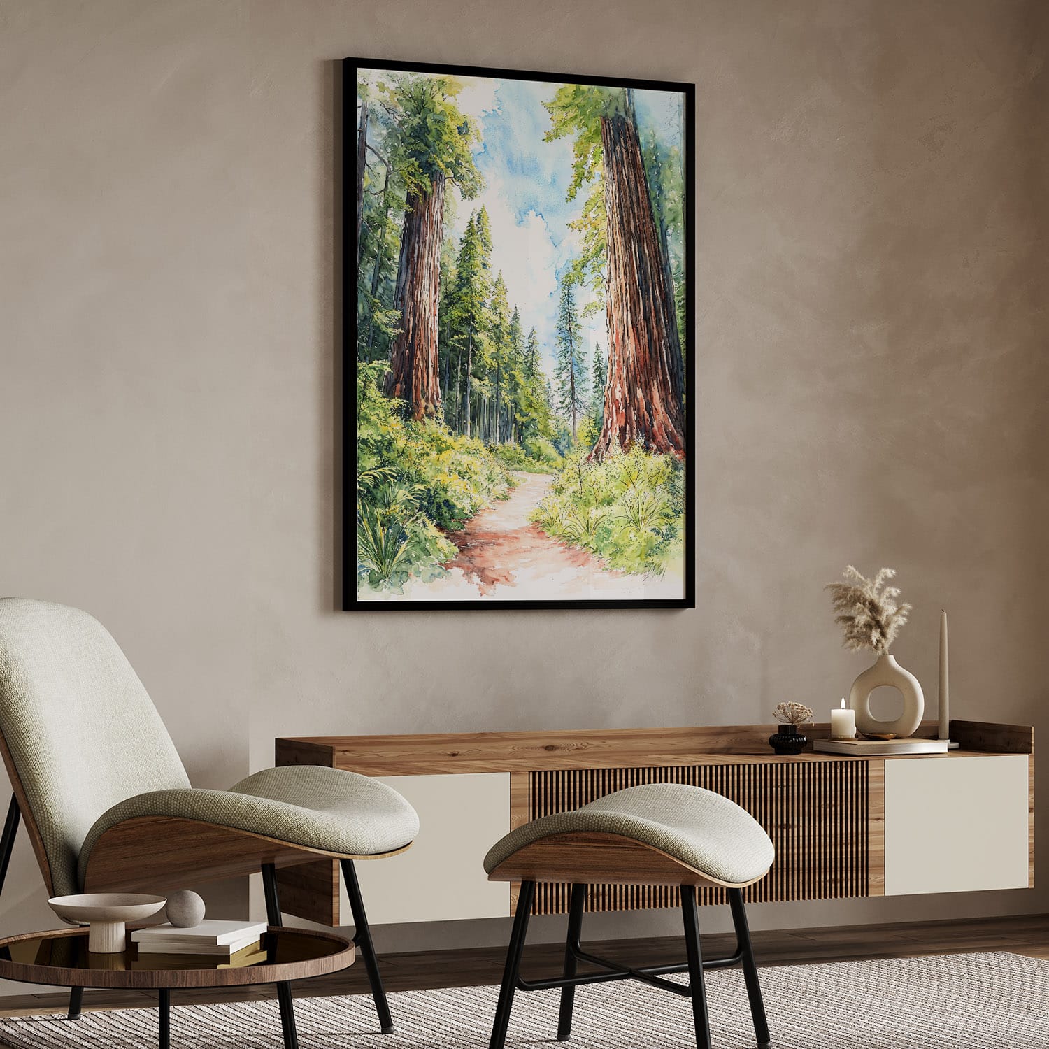 This digital download wall art features tall redwoods and vibrant greens, bringing a touch of nature indoors. Instantly available, it’s easy to print and display in any home or workspace.