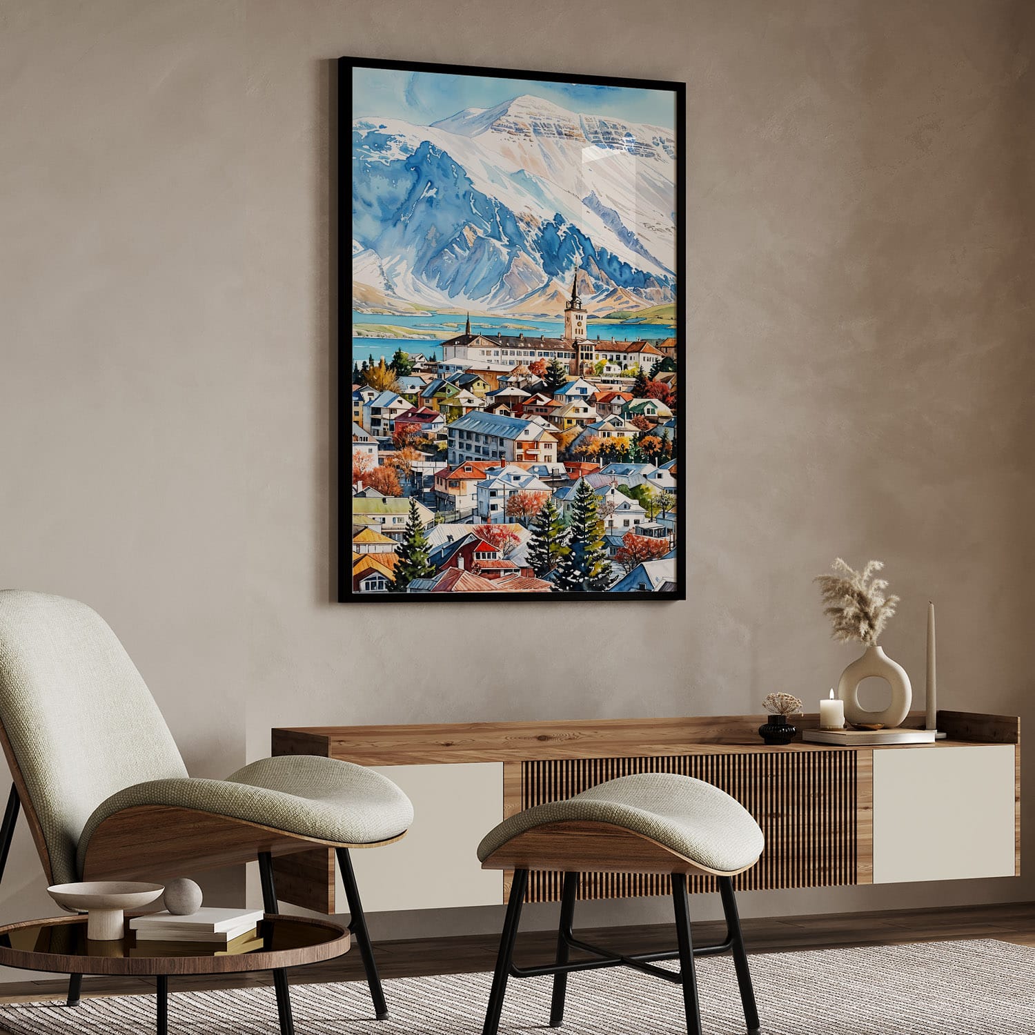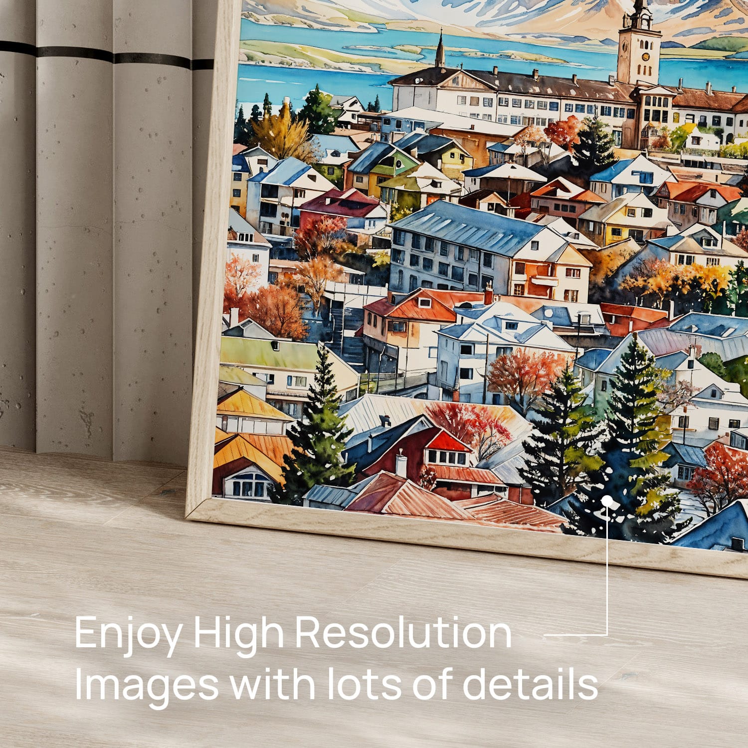 Experience the charm of Reykjavik through this colorful artwork that highlights the city’s unique architecture against a backdrop of majestic mountains. The gentle hues and lively details create a warm atmosphere, making it suitable for any space, from living rooms to offices. Delivered as a high-resolution file, it can be printed at home or through a local shop. Enjoy instant access to refresh your decor or inspire wanderlust in your surroundings.