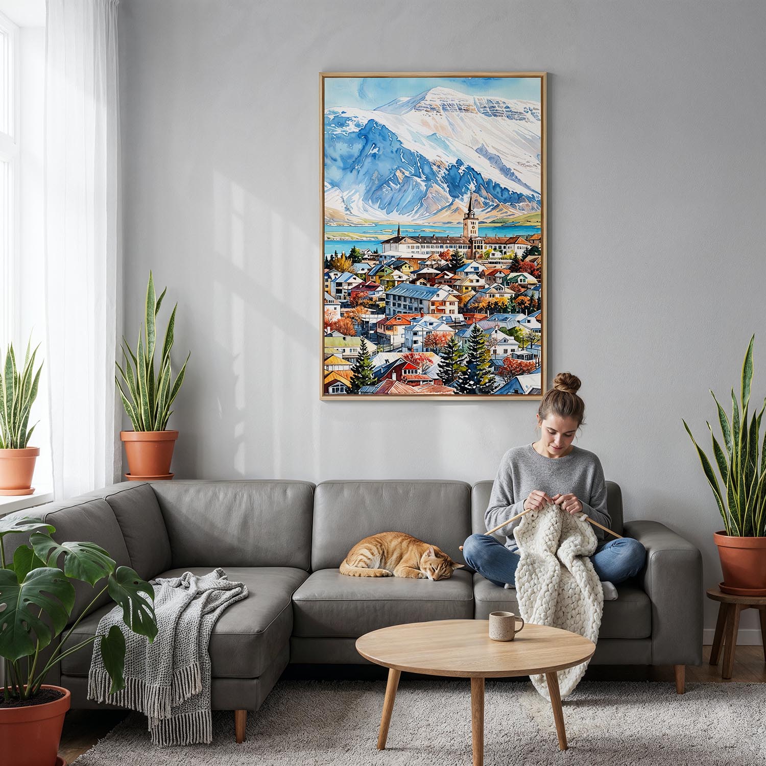 Invite the beauty of Reykjavik into your home with this canvas print. Its vibrant depiction of the city’s unique charm is perfect for living rooms, bedrooms, or offices.