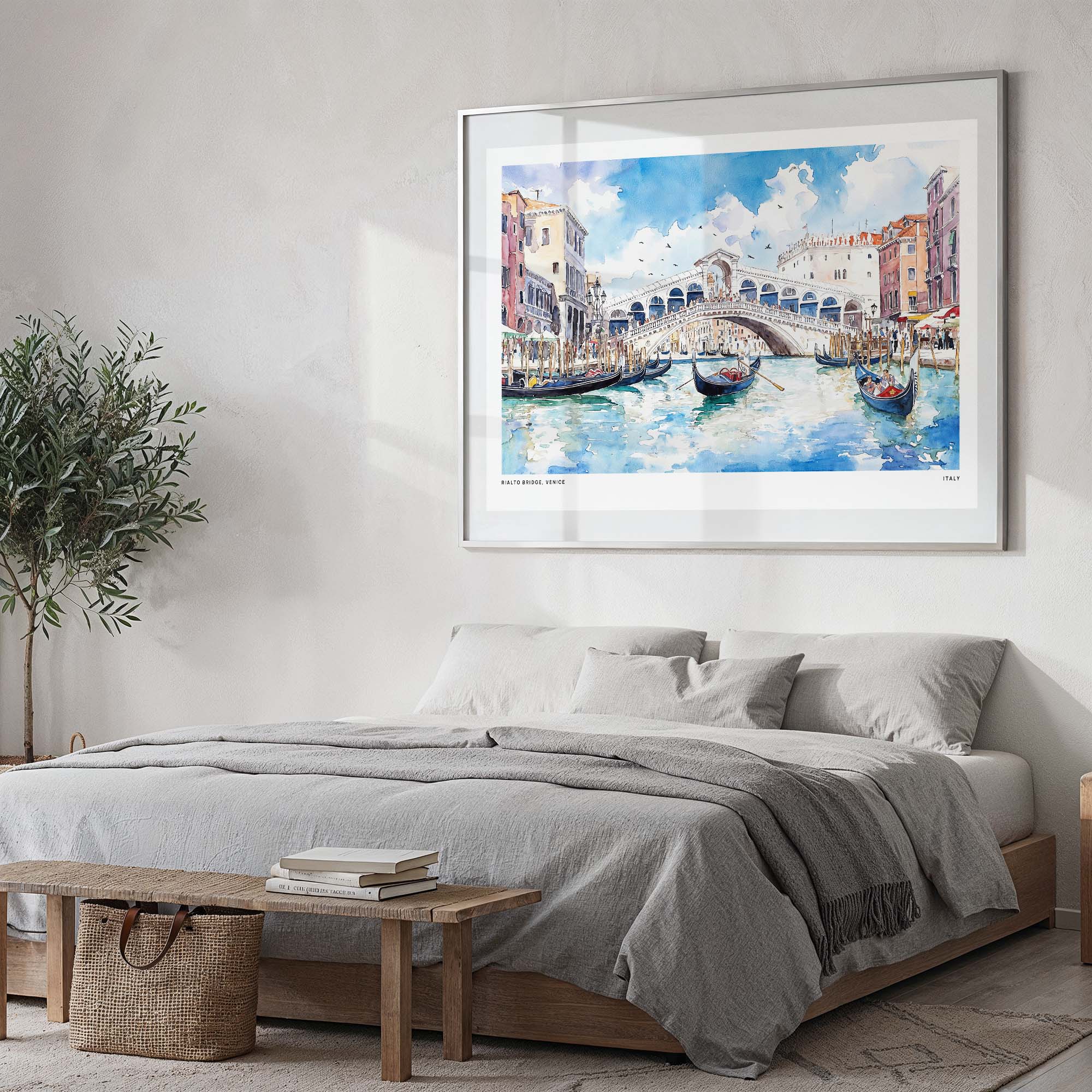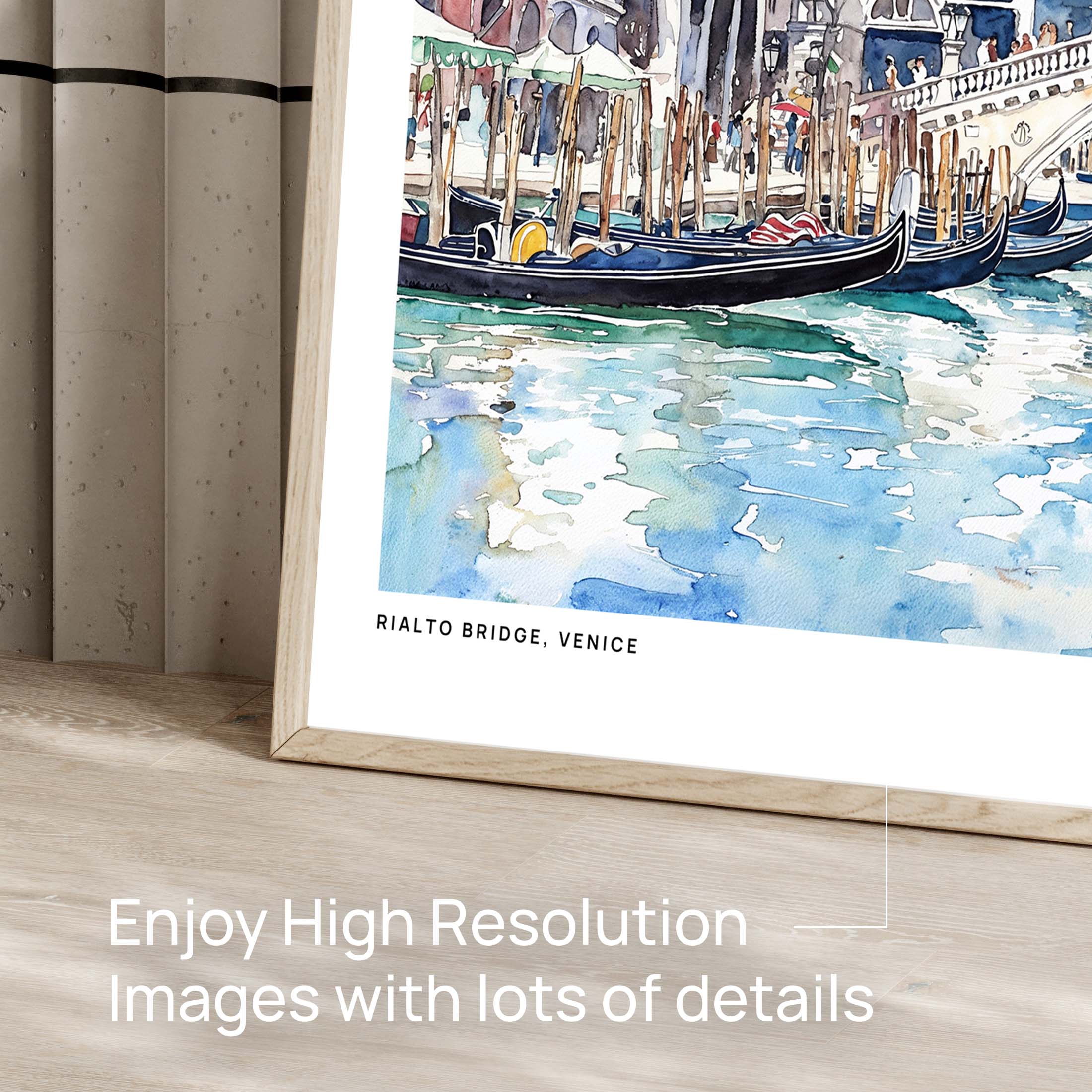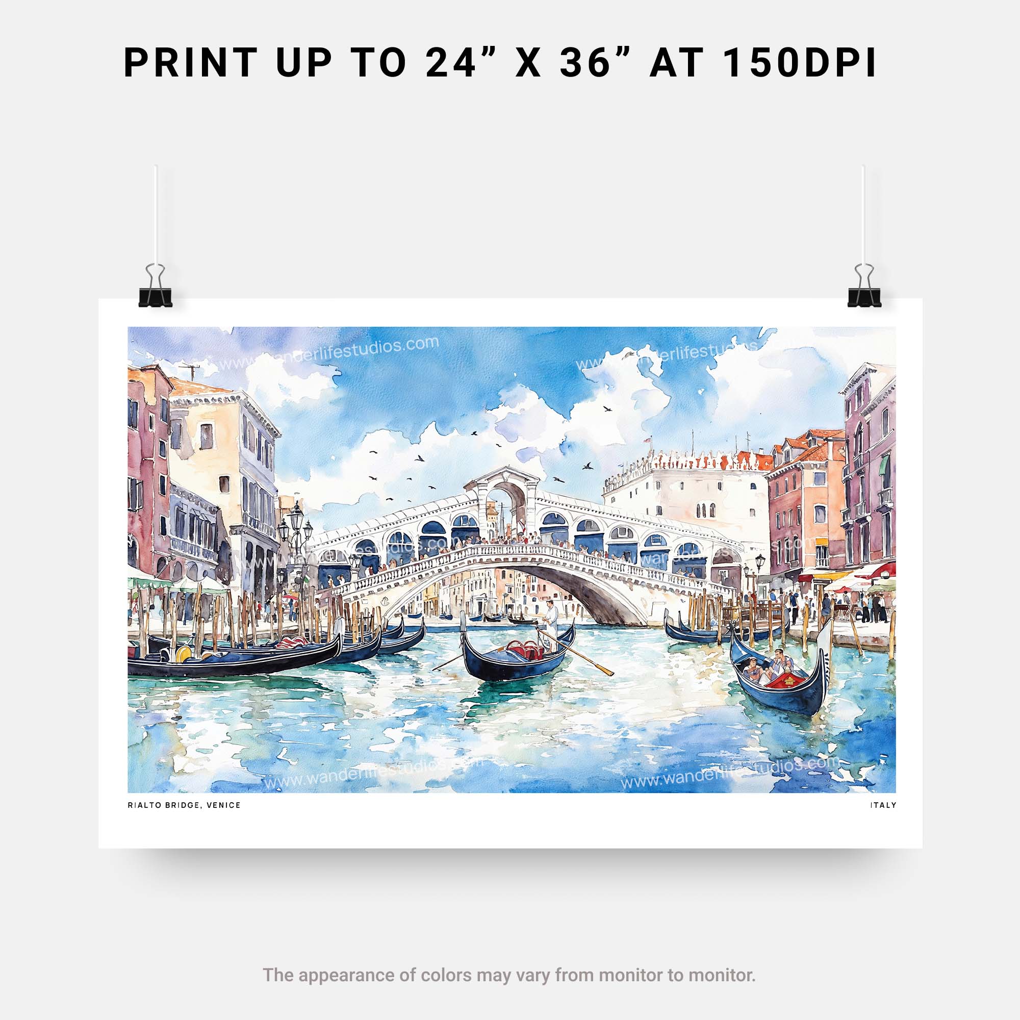 Capture the charm of Venice with this Rialto Bridge digital download wall art. The vibrant watercolor style brings instant color to your walls, making it easy to print and display in any home or workspace.