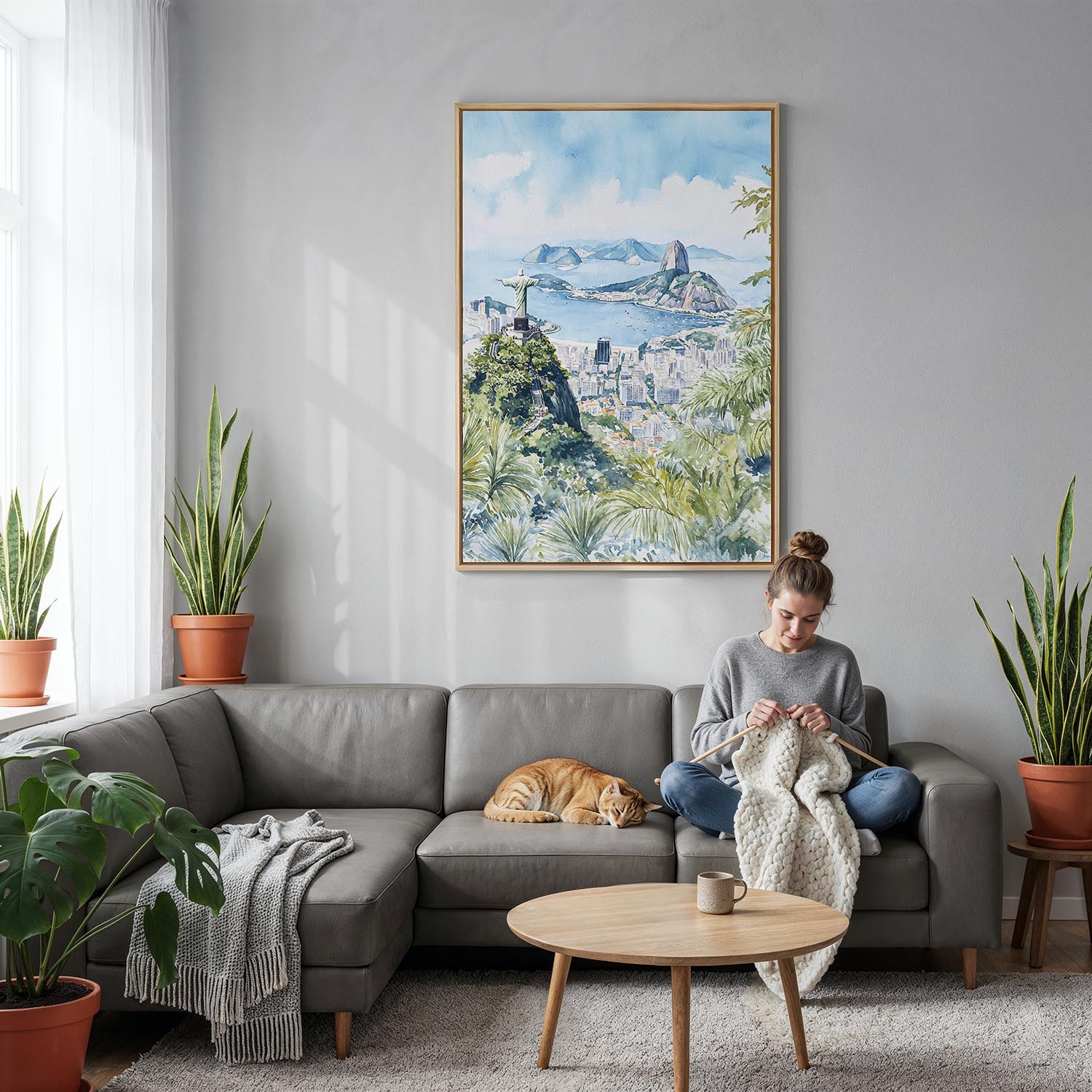 This canvas print captures the breathtaking view of Rio de Janeiro, showcasing its mountains and coastlines in a soft watercolor style. It’s a ready-to-hang piece perfect for your living room, office, or cozy bedroom.
