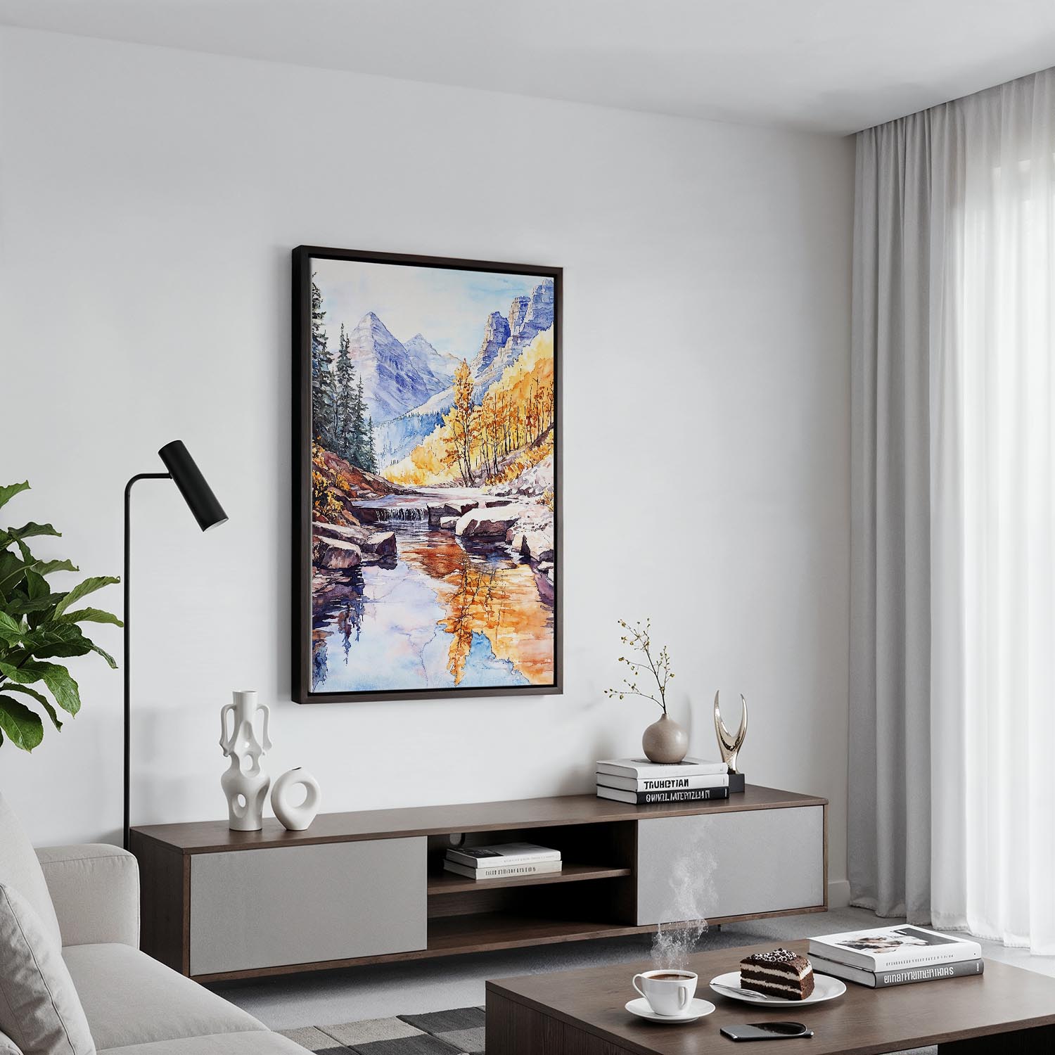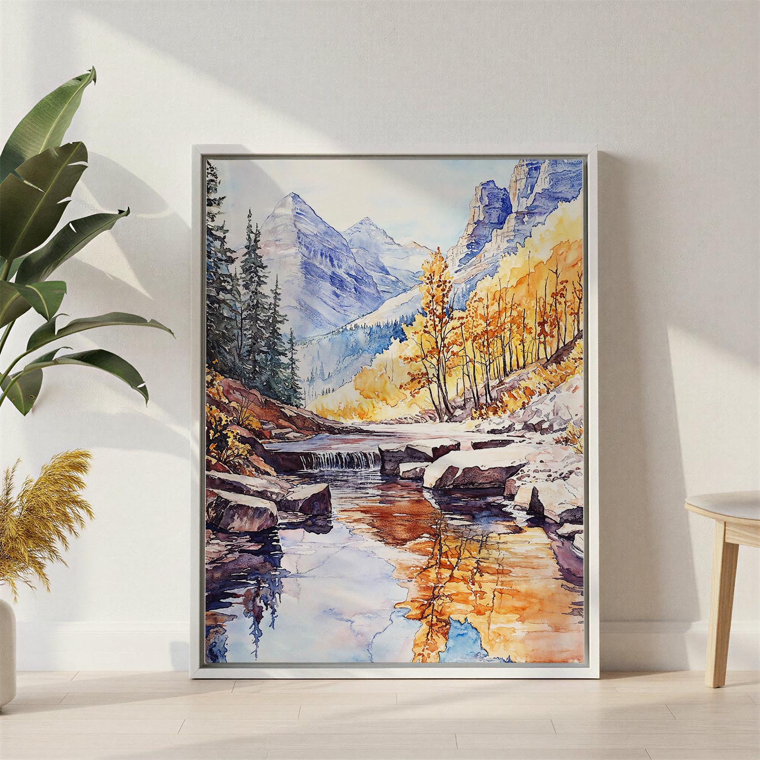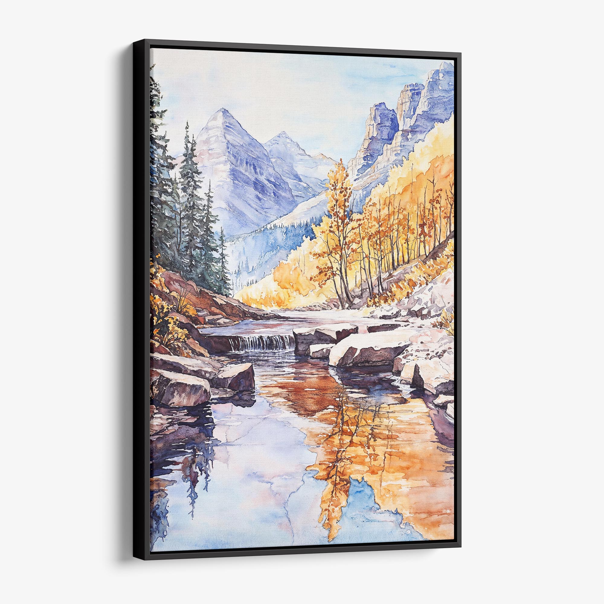 Experience the breathtaking beauty of the Rocky Mountains with this stunning canvas print. The artwork captures the vibrant colors of the landscape, from autumn leaves to rugged peaks, creating a visual narrative that evokes a sense of peace and awe. Available in various finishes, including unframed and with a floater frame, this piece is crafted on hand-stretched canvas using fade-resistant inks.