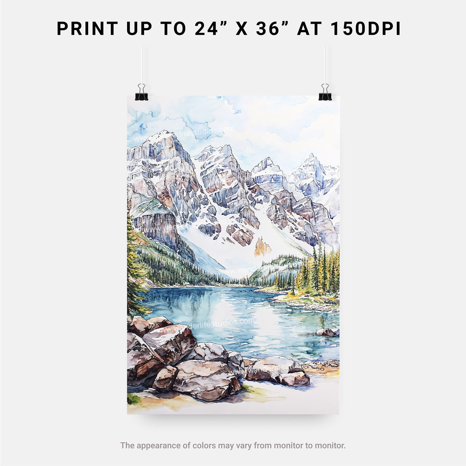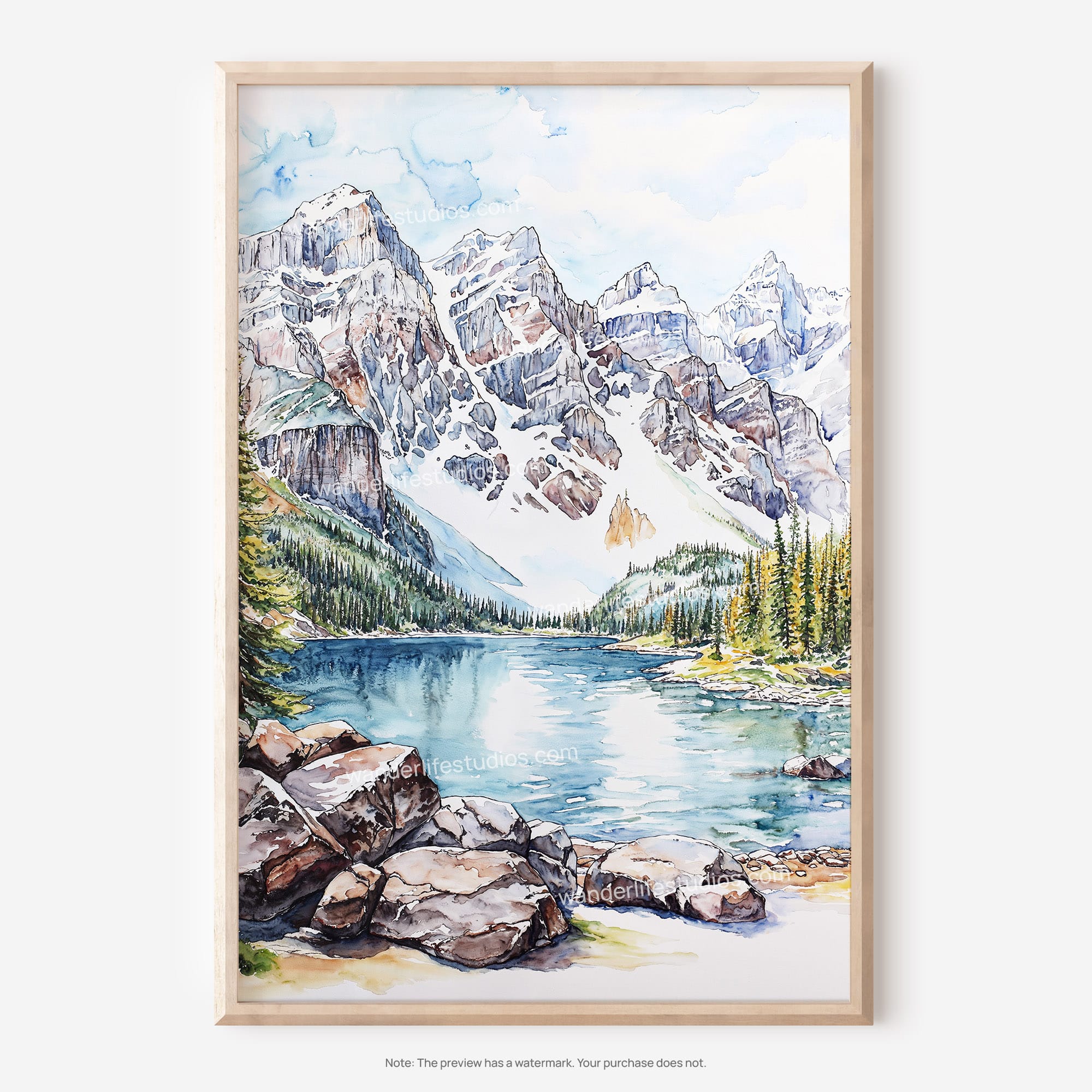 This Rocky Mountains digital download wall art captures the majestic Ten Peaks in a beautiful watercolor style. It’s easy to print and display, bringing nature’s grandeur right into your home.