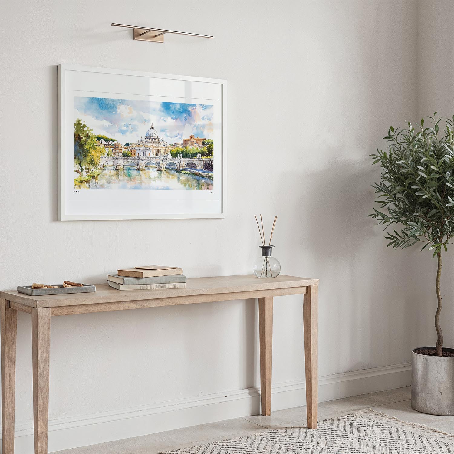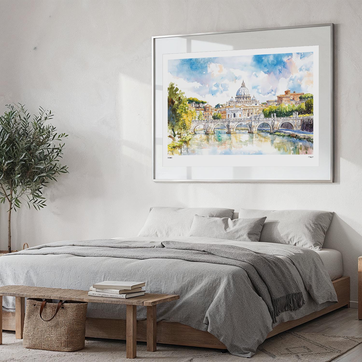 This watercolor art print beautifully captures the essence of Rome’s Vitrus Capitol, showcasing iconic architecture and vibrant reflections on the water. The artwork invites you to experience the charm of this historic city right from your wall.