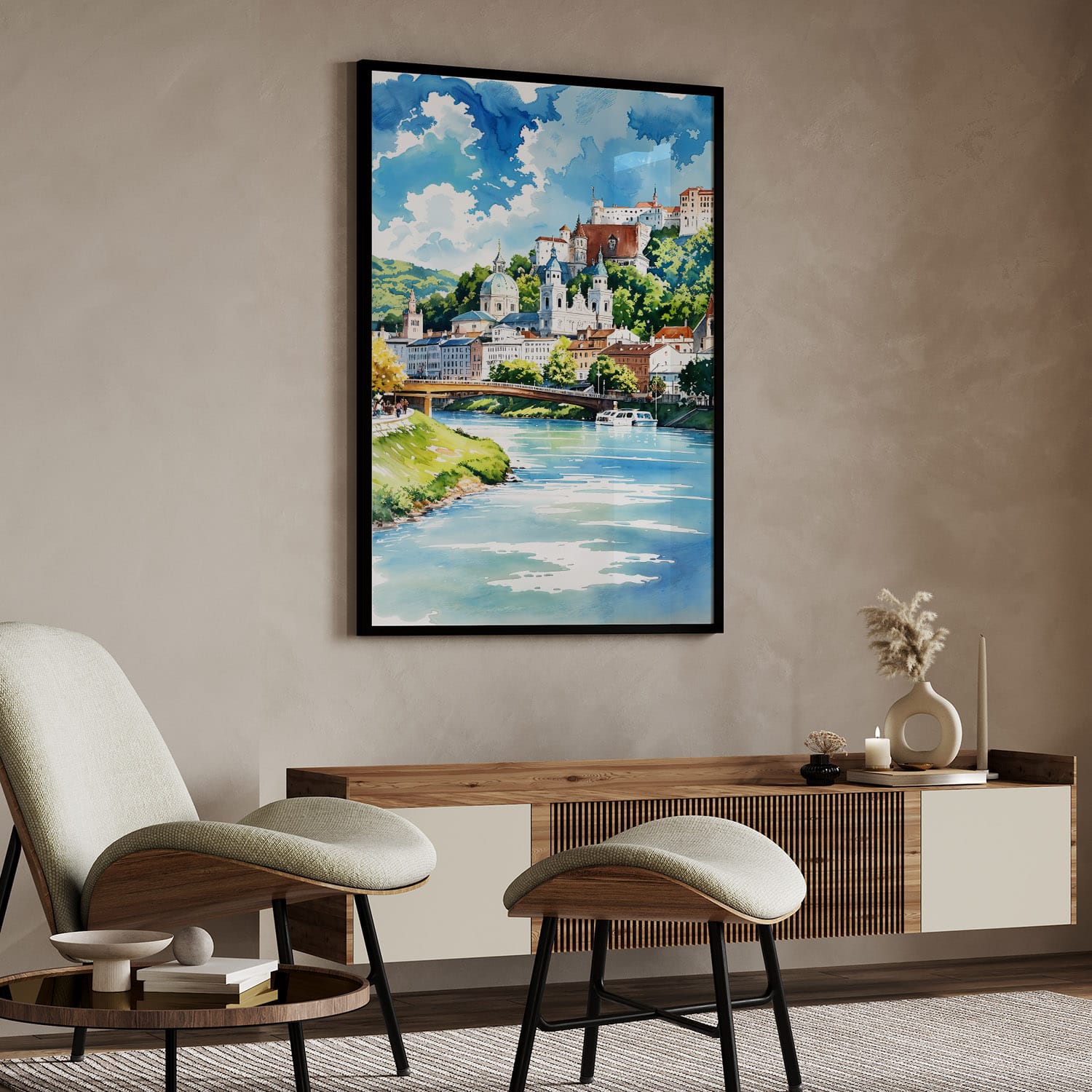 This artwork captures the enchanting beauty of Salzburg with its colorful buildings and stunning landscapes. The bright tones and lively details create a warm atmosphere, making it a delightful addition to any room. Available as a high-resolution digital file, it can be printed in various sizes for your home, office, or as a gift. Enjoy instant access to this charming piece, perfect for showcasing your love for travel or history.