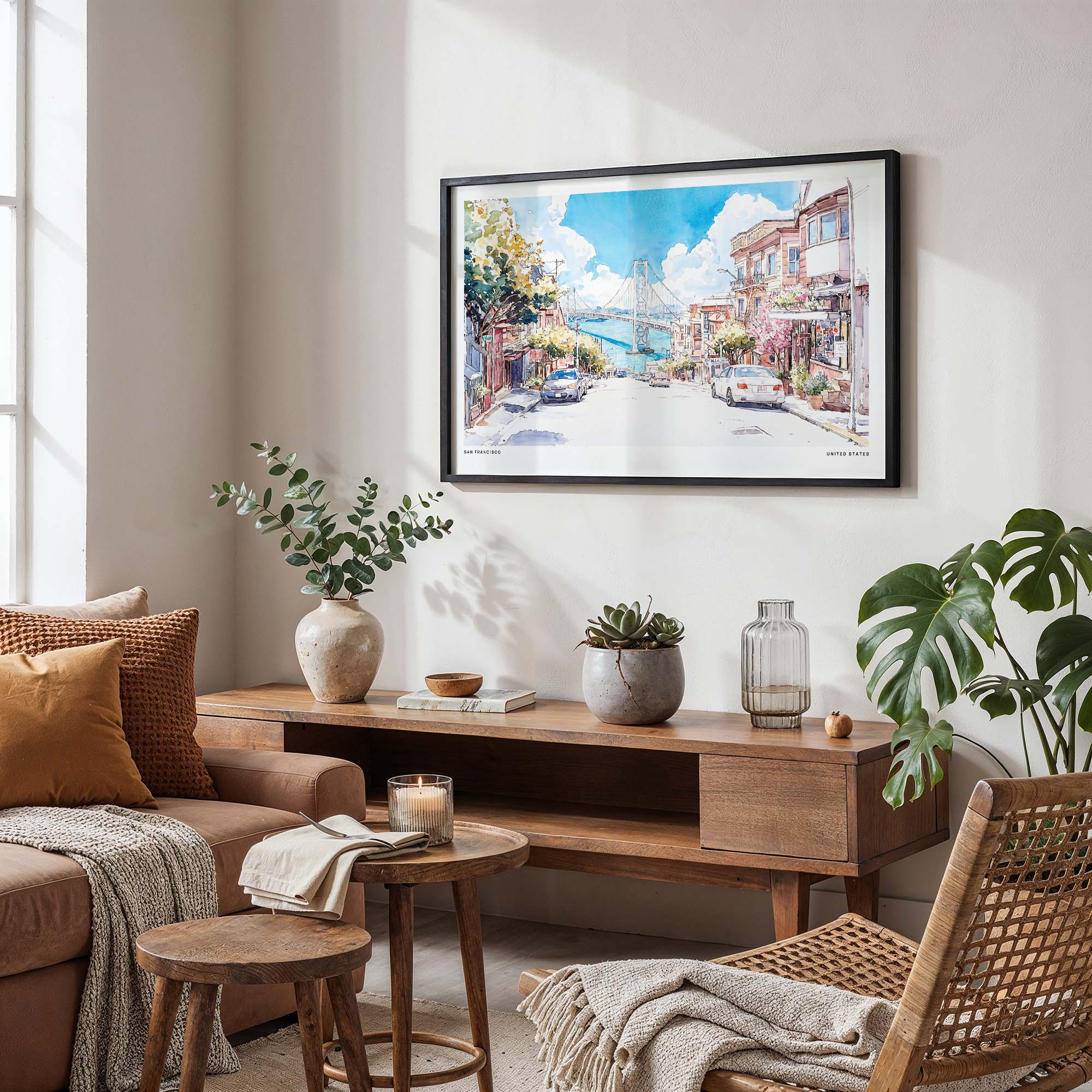 This charming artwork highlights the iconic Lombard Street in San Francisco, showcasing its famous winding road and lush surroundings. The bright colors and lively scene evoke a sense of wanderlust and warmth, making it a delightful addition to your space. Delivered as a high-resolution JPG file, this artwork is easy to print at home or through a local print shop. It’s perfect for living rooms, bedrooms, or offices, offering an instant touch of personality and flexibility for any decor style.