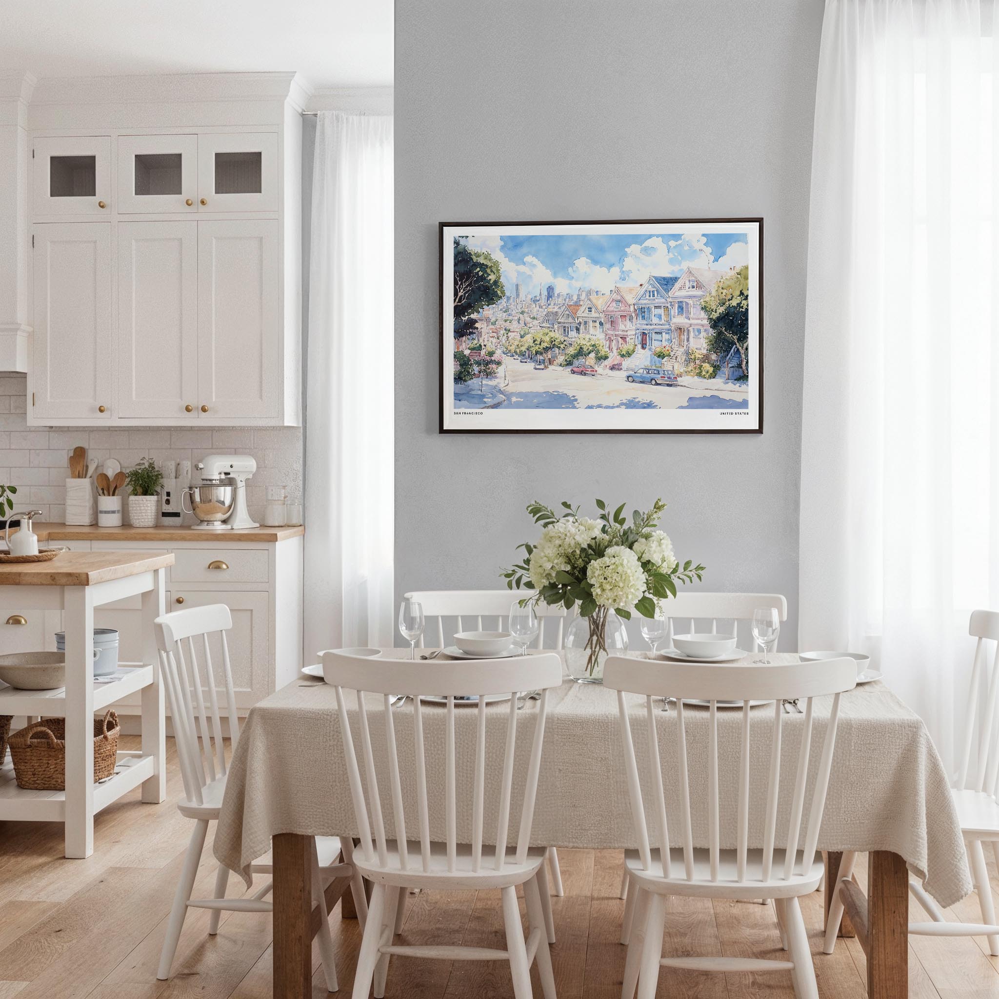 This artwork features the famed Painted Ladies of San Francisco, beautifully captured in soft watercolor tones. The piece brings a sense of warmth and nostalgia to any space, making it an inviting addition to your home. Printed on a stretched canvas with fade-resistant inks and solid wood stretcher bars, it arrives ready to hang. Ideal for living rooms, bedrooms, or cozy offices, this piece also makes a thoughtful gift for fans of urban landscapes.