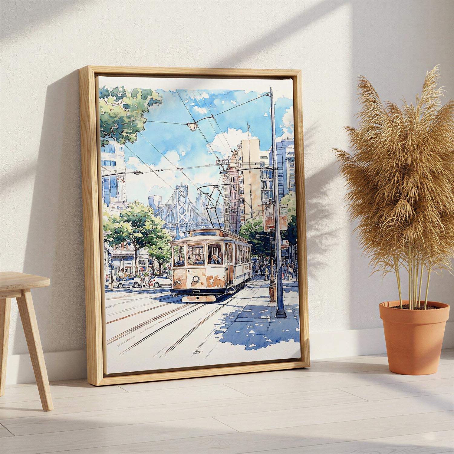 Experience the lively streets of San Francisco with this enchanting canvas print. The artwork beautifully captures a nostalgic streetcar navigating through the city’s vibrant landscape, framed by modern architecture and lush trees.