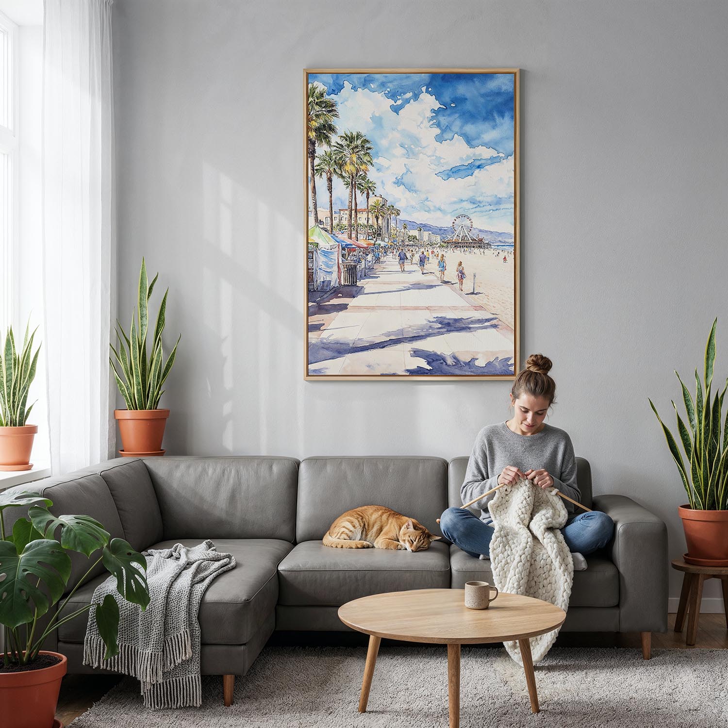 Experience the vibrant energy of Santa Monica with this watercolor canvas print. It beautifully captures the lively beachfront atmosphere, showcasing palm trees, the iconic pier, and a striking blue sky.