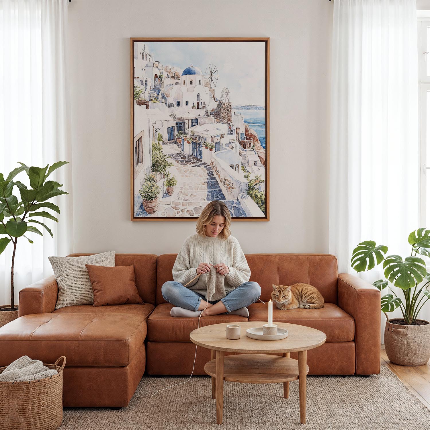 Infuse your space with the charm of Santorini through this canvas print. Featuring iconic blue domes and quaint streets, it’s ideal for any room and arrives ready to hang.
