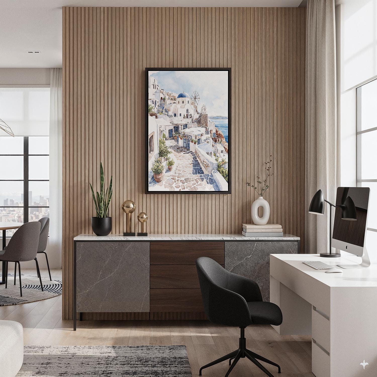Explore the beauty of Santorini, Greece, captured in this serene watercolor canvas print. The artwork showcases the island’s signature blue domes and winding pathways, inviting the warmth of the Mediterranean into your home. Available in various finishes, including unframed and floater frame options, this piece is made with hand-stretched canvas on solid wood stretcher bars using fade-resistant inks for durability. Perfect for living rooms, bedrooms, or offices, it brings a touch of coastal elegance to any space. This canvas print also makes a thoughtful gift for anyone yearning for a slice of island life.