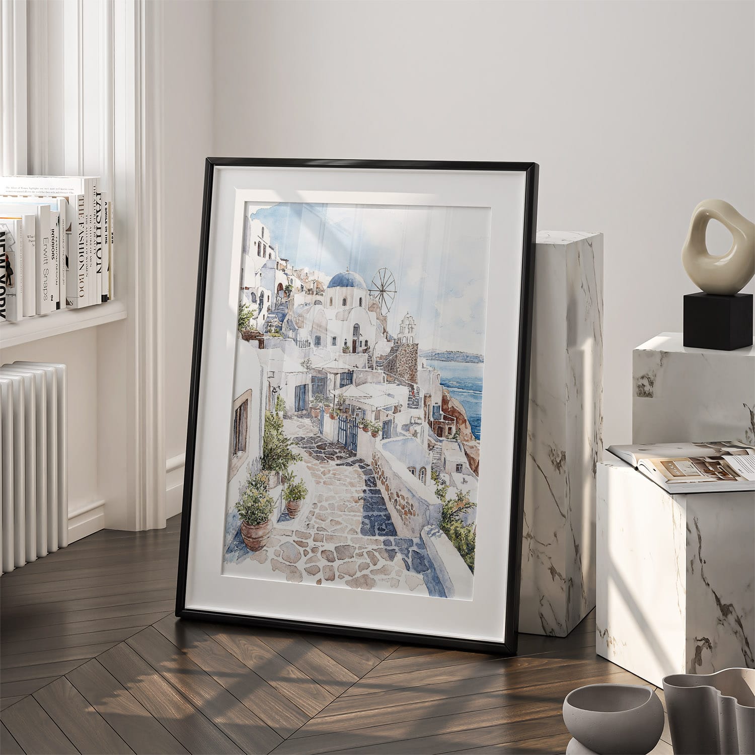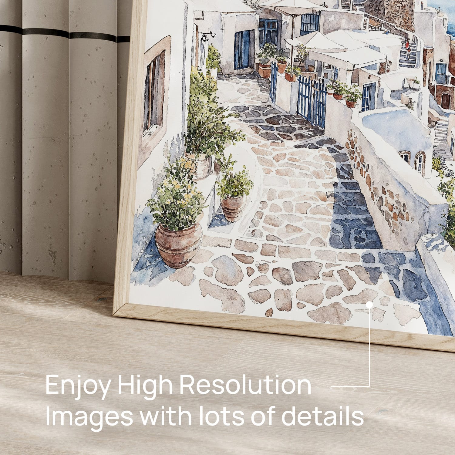 Capture the essence of Santorini with this beautiful watercolor wall art. Instantly download and print it at home or your local print shop to enhance any space with a touch of Greek charm.