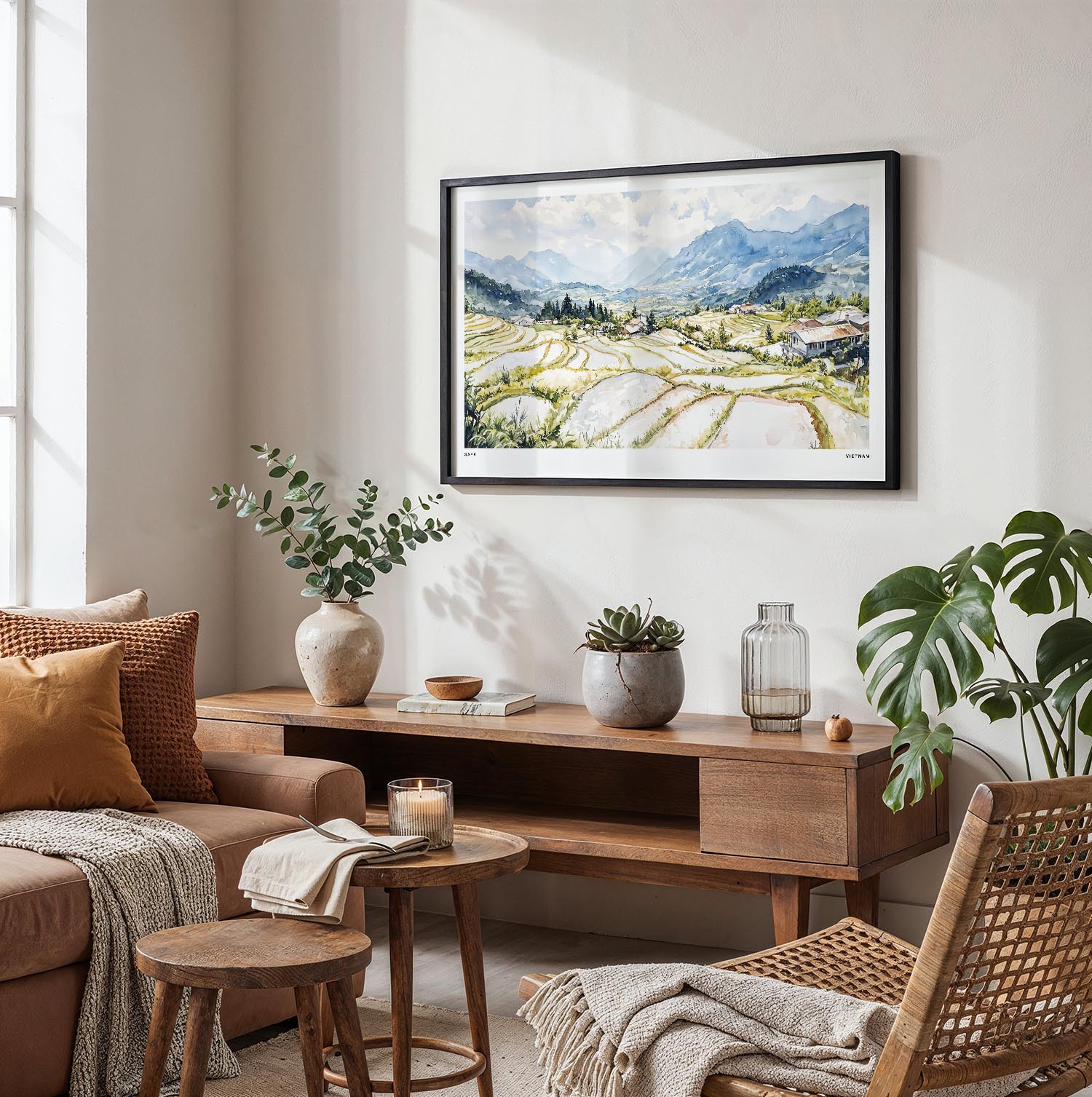 Capture the breathtaking beauty of Sapa Valley with this enchanting art print. The artwork showcases vibrant rice terraces nestled against a backdrop of rolling mountains, reflecting the unique harmony of nature and culture in Vietnam. Available in various finishes, including unframed and framed options with locally sourced wood, this piece is printed on premium matte paper using fade-resistant inks.