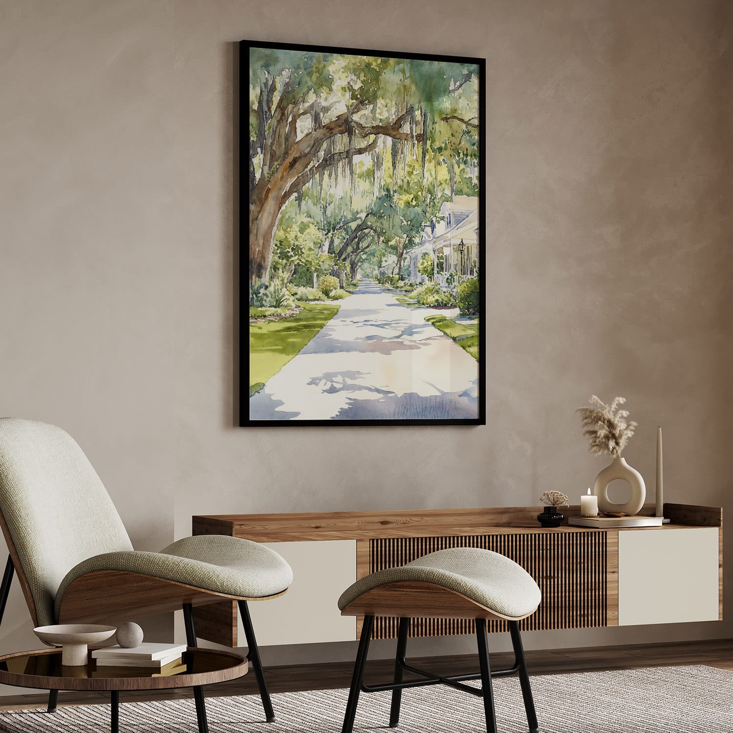 This artwork beautifully portrays a sunlit street in Savannah, featuring sprawling trees and classic homes, evoking a sense of southern charm. Its soft, natural tones create a warm atmosphere ideal for living rooms, studies, or any space needing a touch of nature. Delivered as a high-resolution digital file, this art can be printed in various sizes effortlessly at home or through your local print shop. Enjoy instant access, allowing you to refresh your walls right away.
