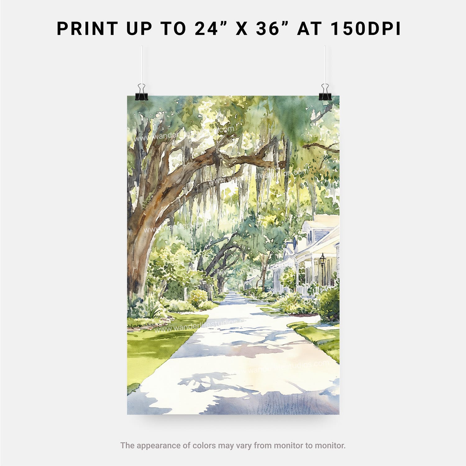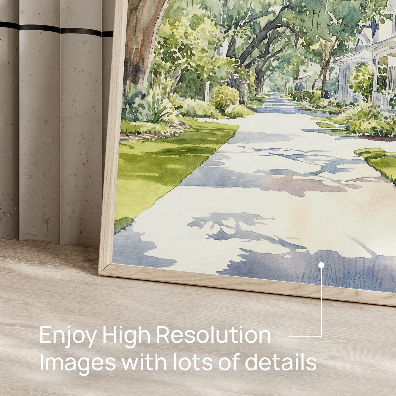 This digital download wall art captures the charm of Savannah, Georgia, showcasing lush greenery and historic homes. Enjoy instant access for easy printing at home or a local shop, perfect for enhancing your living space.