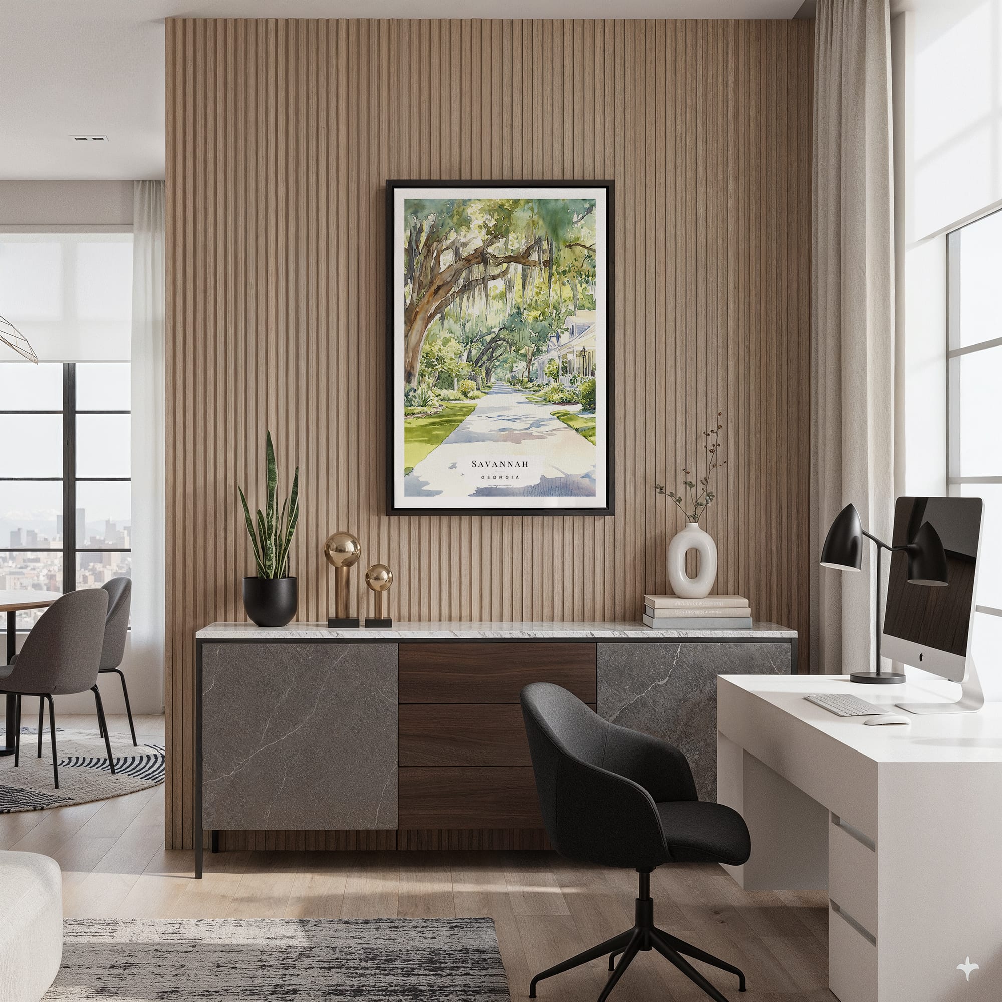 This Savannah, Georgia canvas art print invites a touch of southern charm into your space. The soft greens and warm tones capture a serene street scene, making it a welcoming addition to any room.