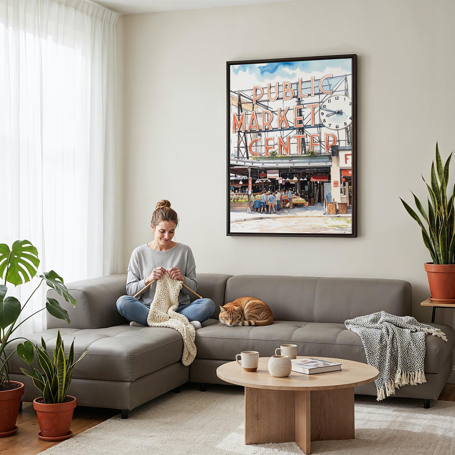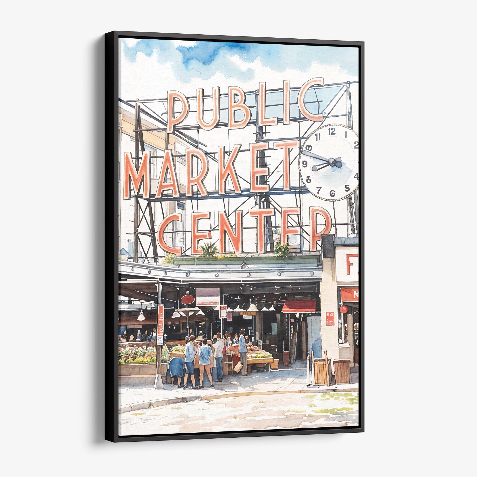Seattle Pike Place Market Canvas Print – Watercolor Street Scene Wall Art