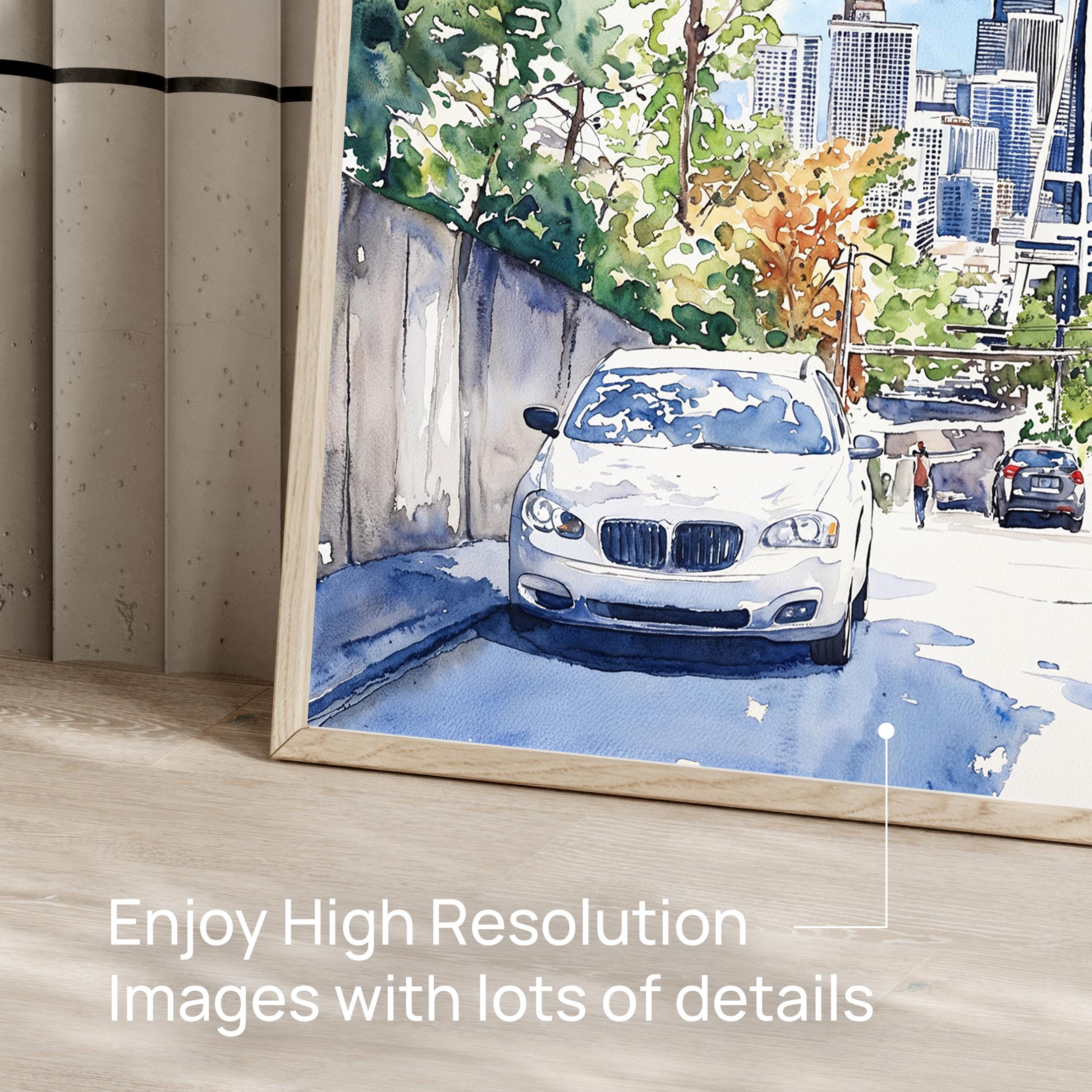 Capture the essence of Seattle with this watercolor skyline digital download wall art. The vibrant hues and intricate details make it easy to print and add a touch of urban charm to your space instantly.