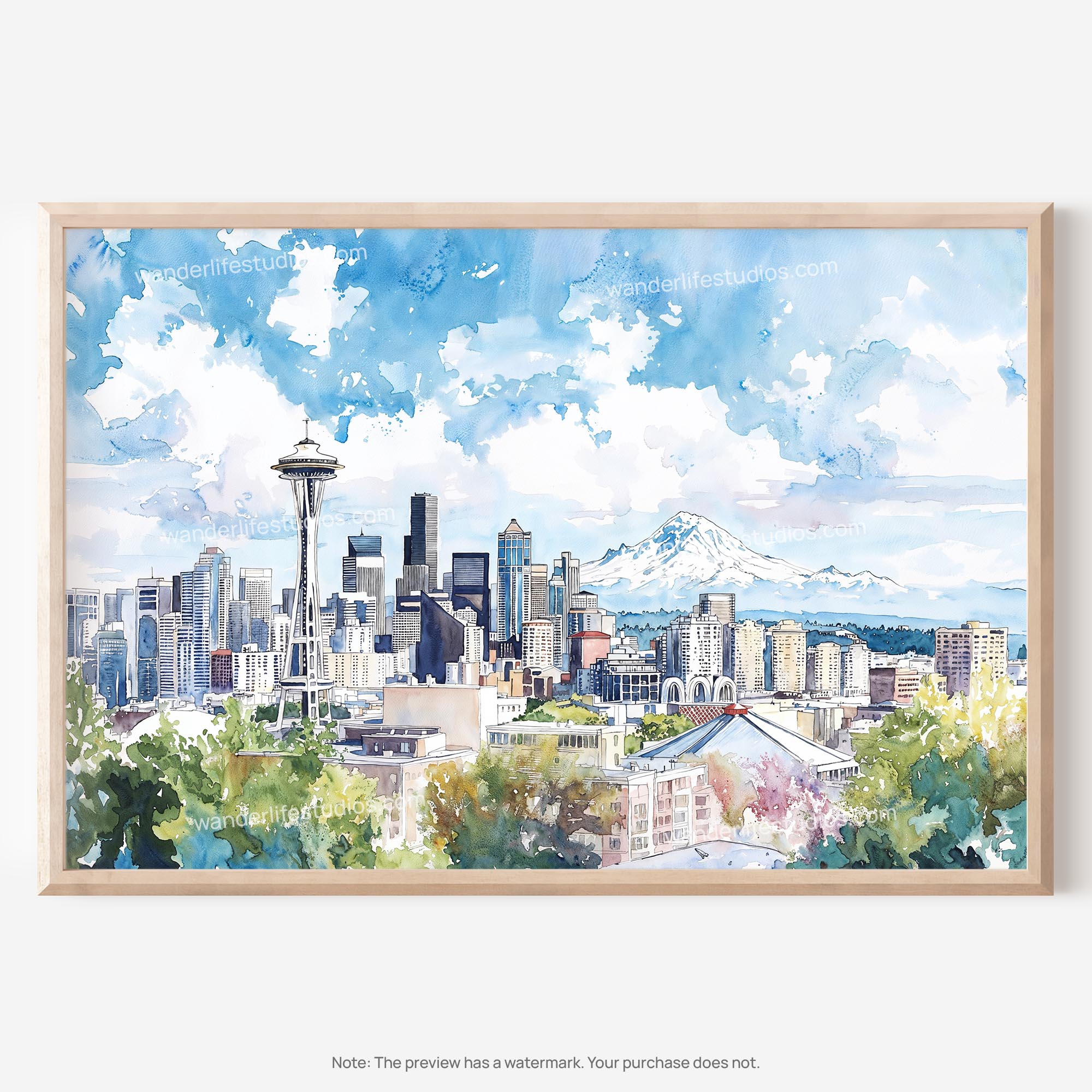 Seattle Skyline with Mount Rainier Watercolor Art – Digital Download Wall Art