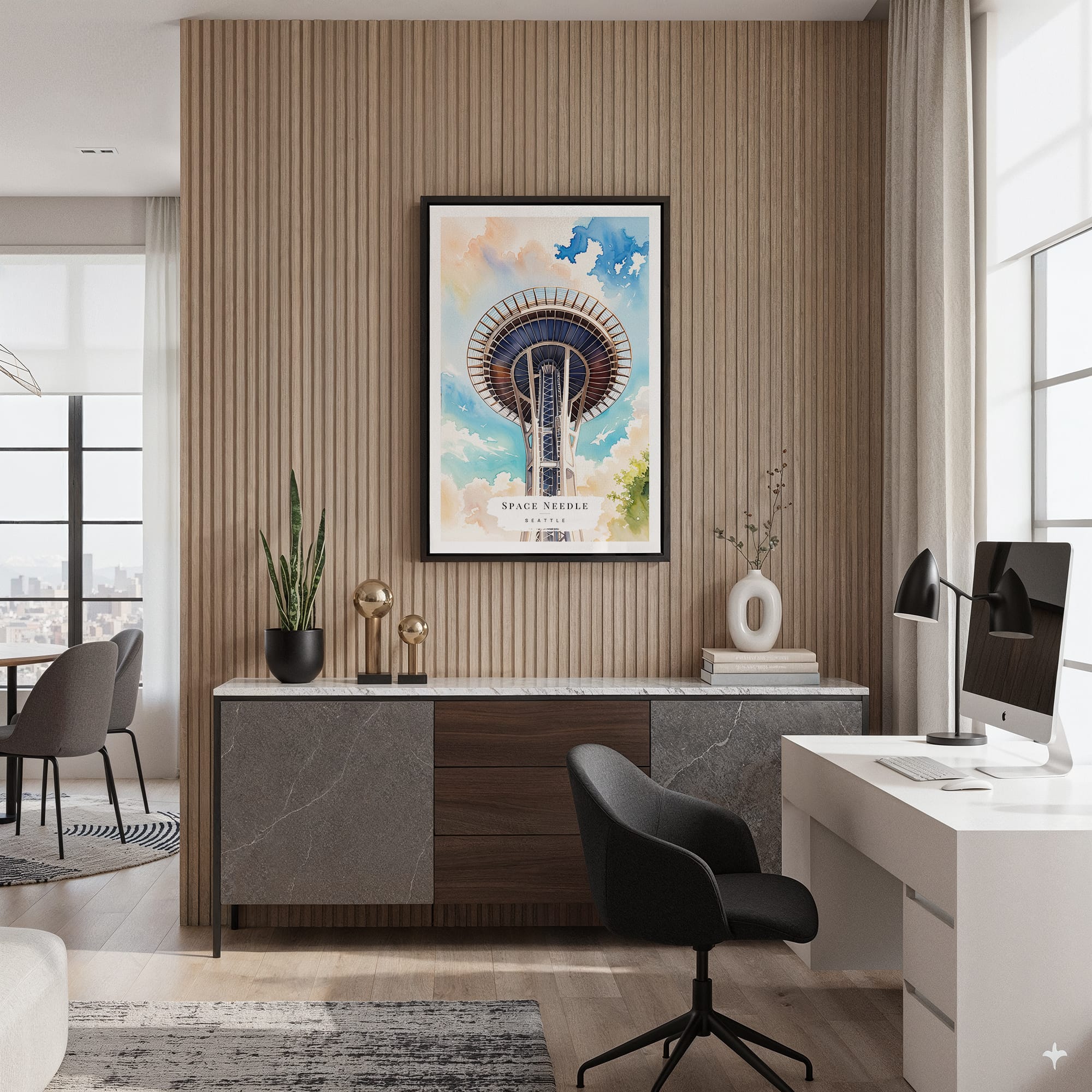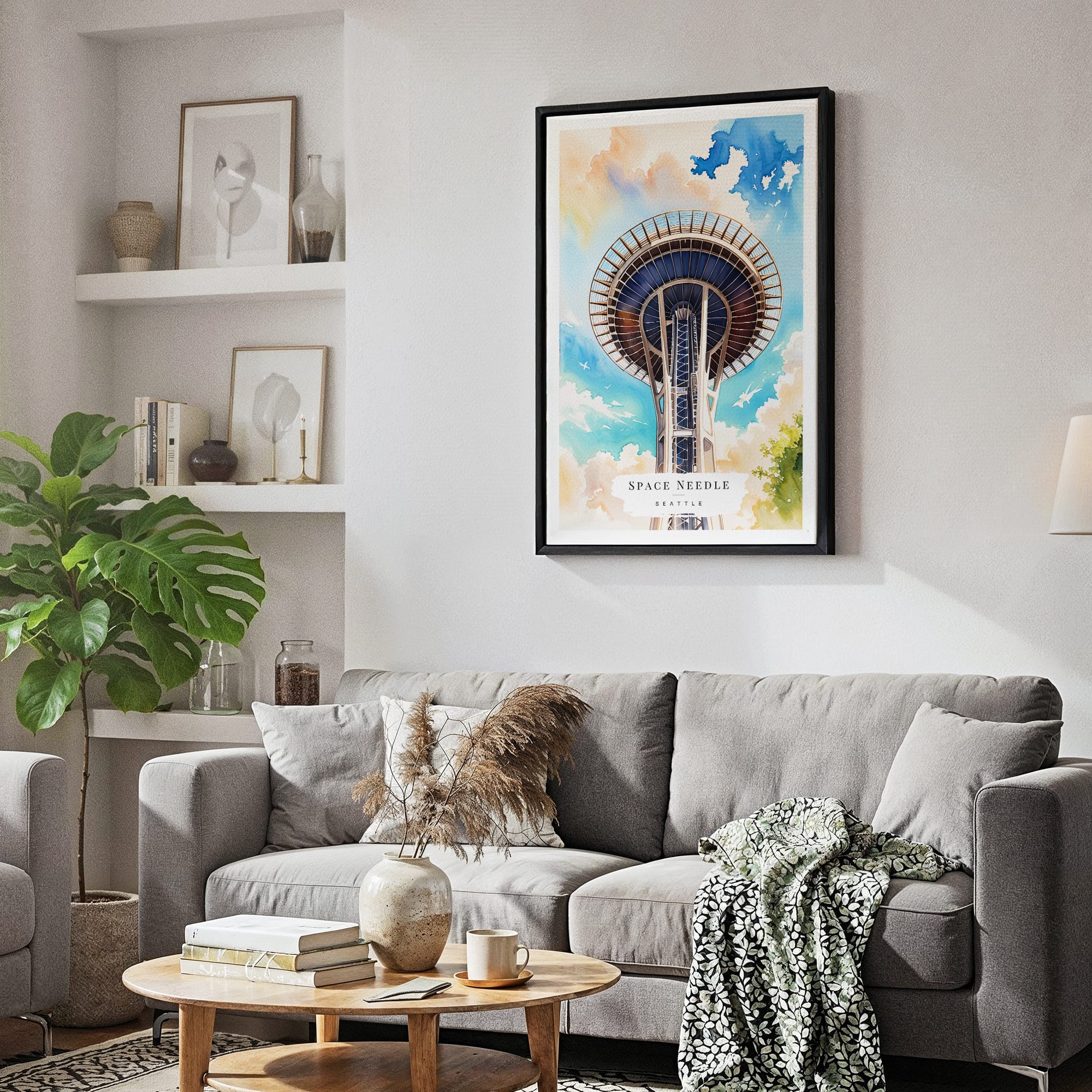 This artwork highlights the iconic Seattle Space Needle with vibrant blues and warm hues that create a lively atmosphere. Its unique perspective brings energy to living rooms or offices. Printed on high-quality canvas with fade-resistant inks, it arrives ready to hang, making it a delightful addition to your home or a thoughtful gift for lovers of cityscapes.