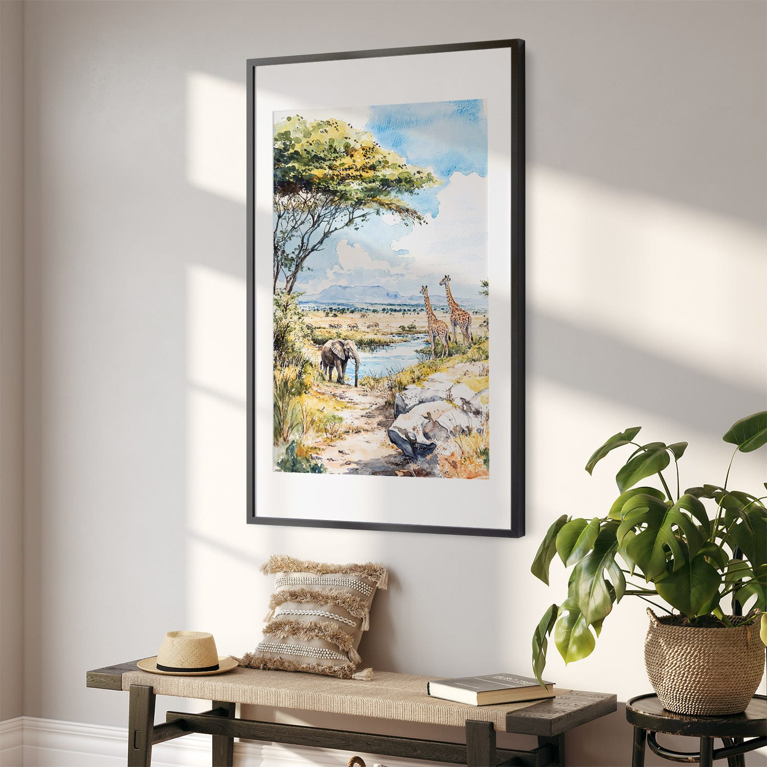 This artwork captures the essence of the Serengeti, showcasing elegant giraffes and a gentle elephant beneath a bright sky. With its warm earth tones and natural scenery, it adds a lovely touch to any room. Provided as a high-resolution digital file, you can easily print it at home or through a local service. Ideal for living rooms, bedrooms, or offices, this piece offers an effortless way to bring a piece of nature into your home with instant access and flexibility.