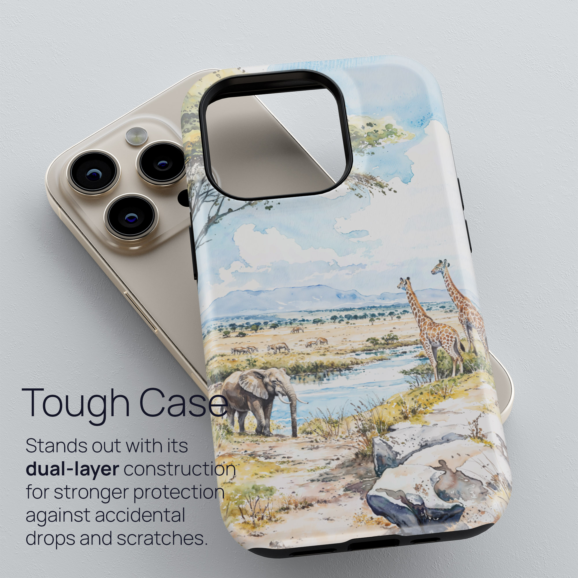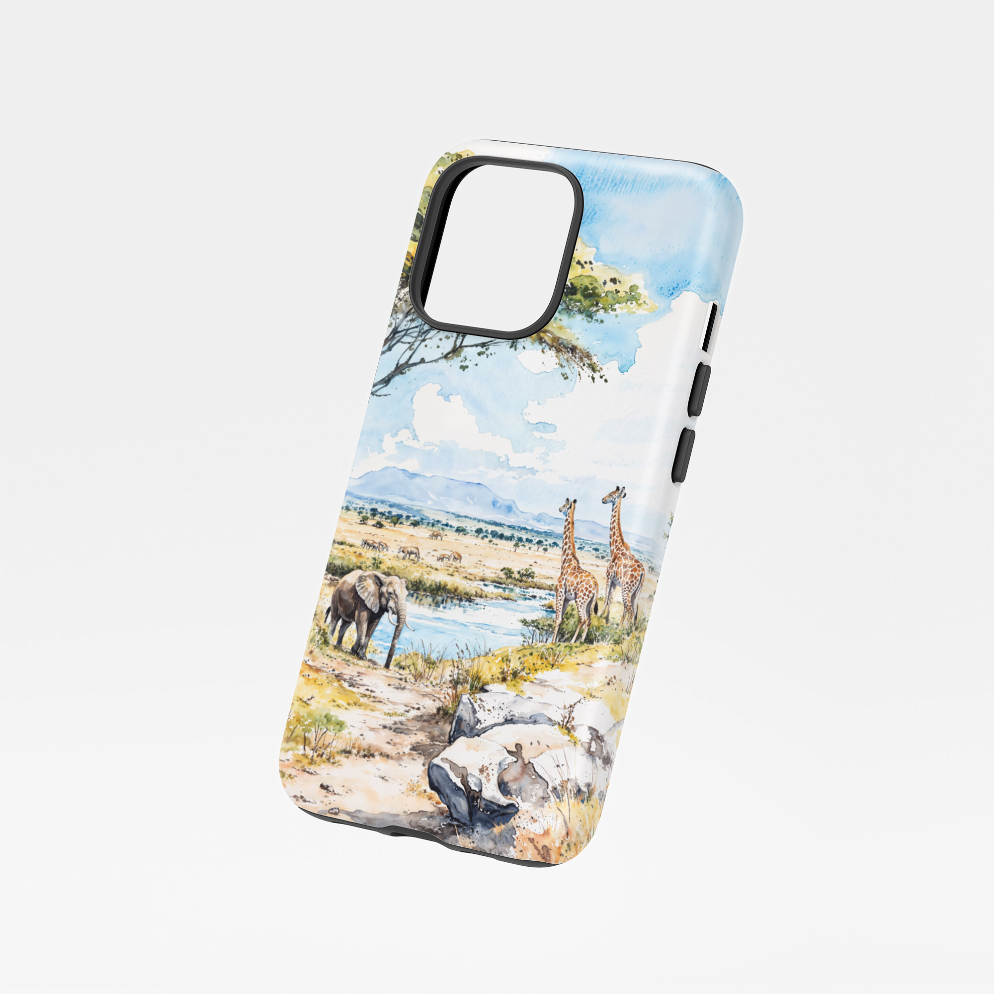 Serengeti Wildlife Phone Case – Watercolor Elephant and Giraffe Design for Animal Lovers