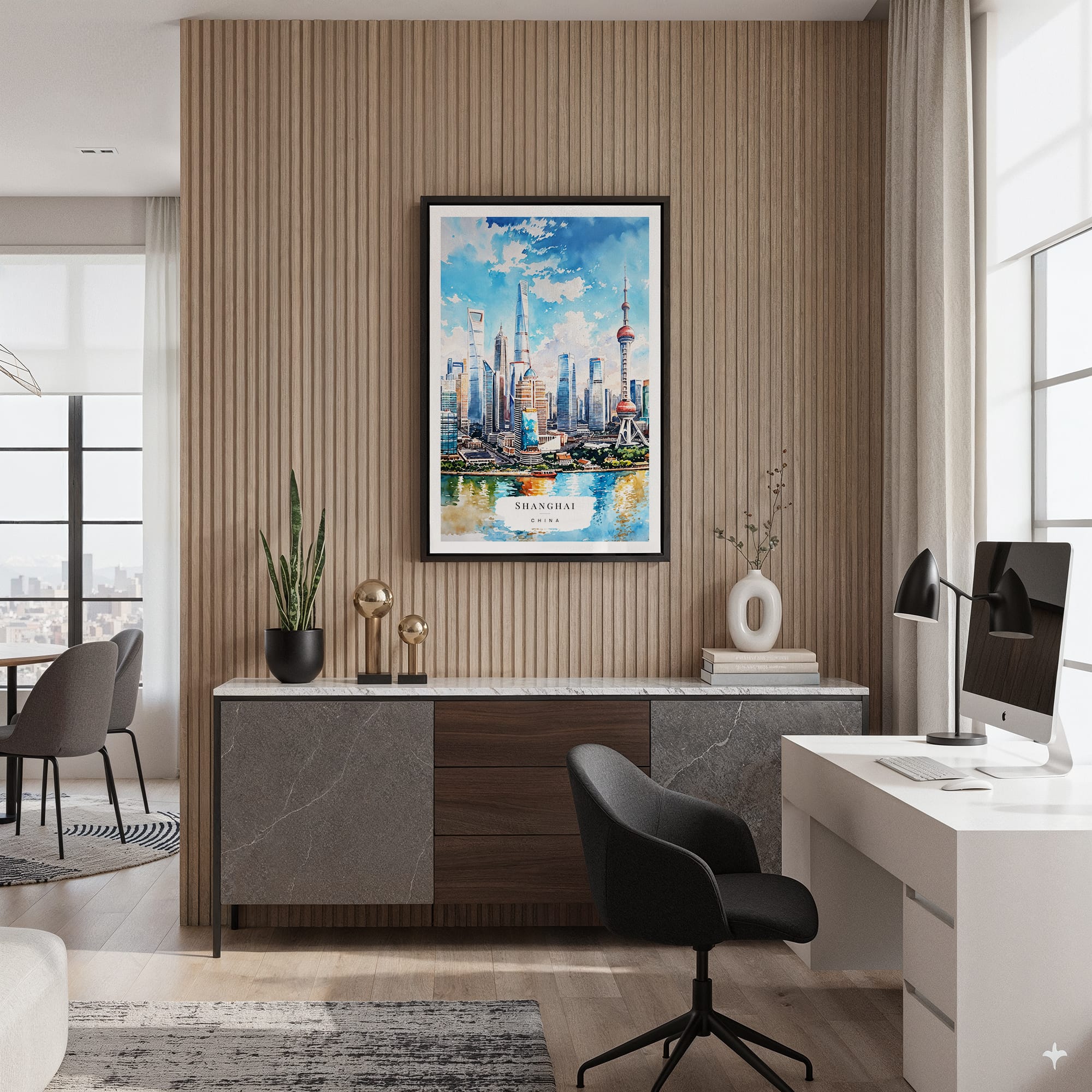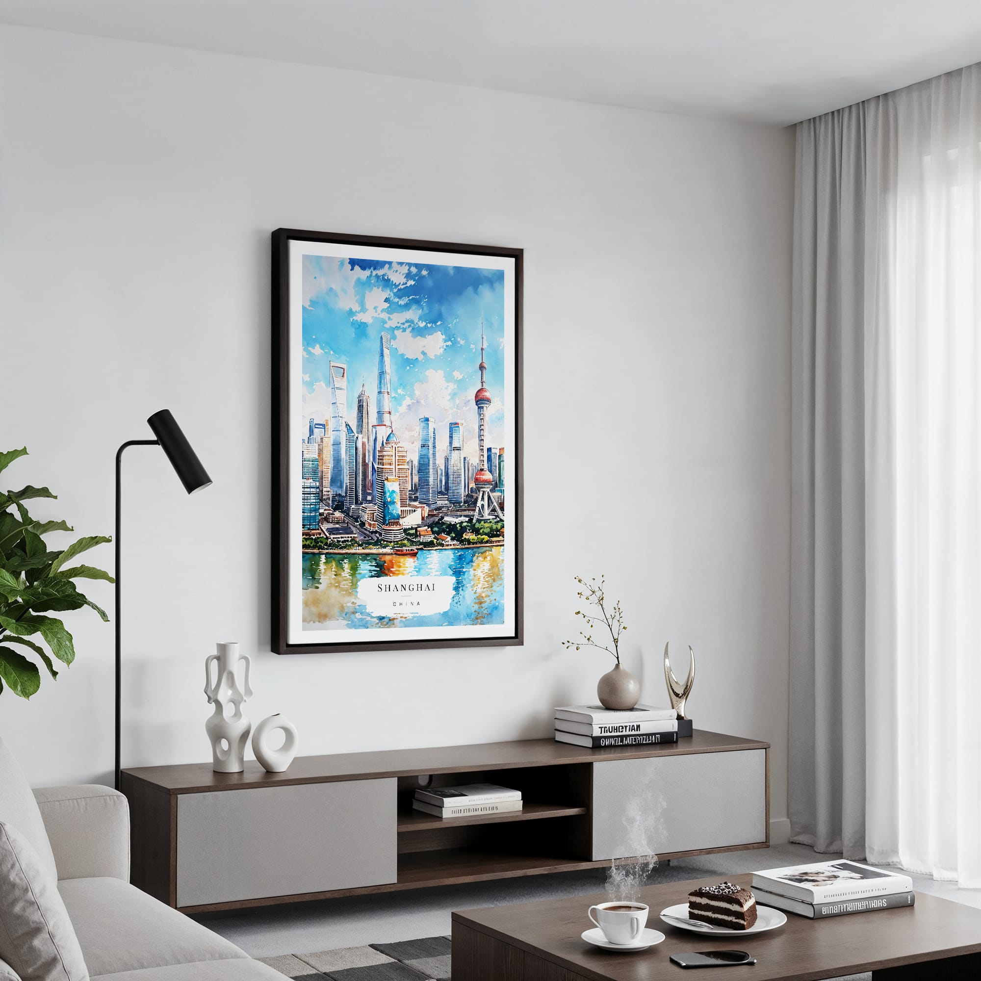 Shanghai China Watercolor Canvas Art Print – Vibrant City Skyline Wall Art