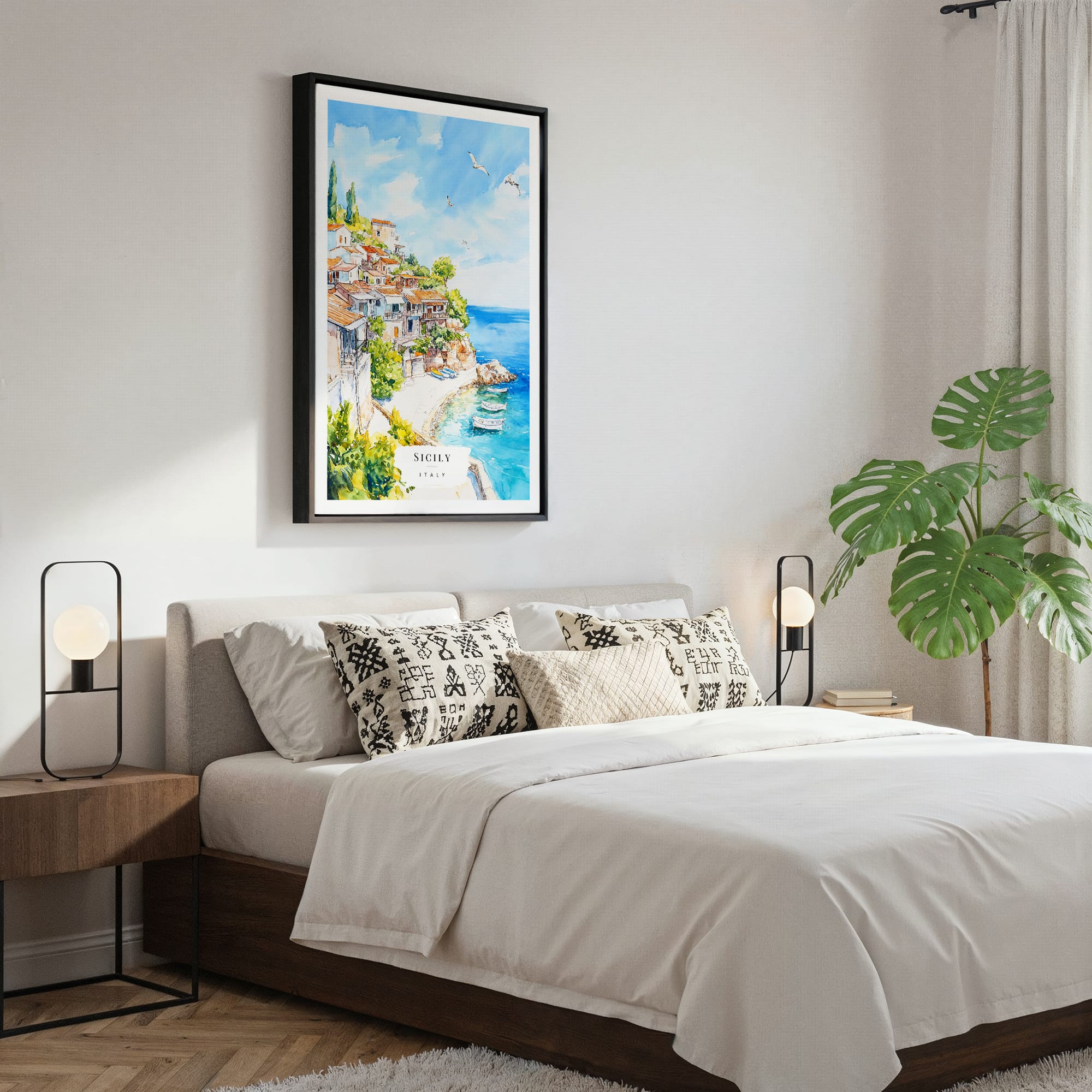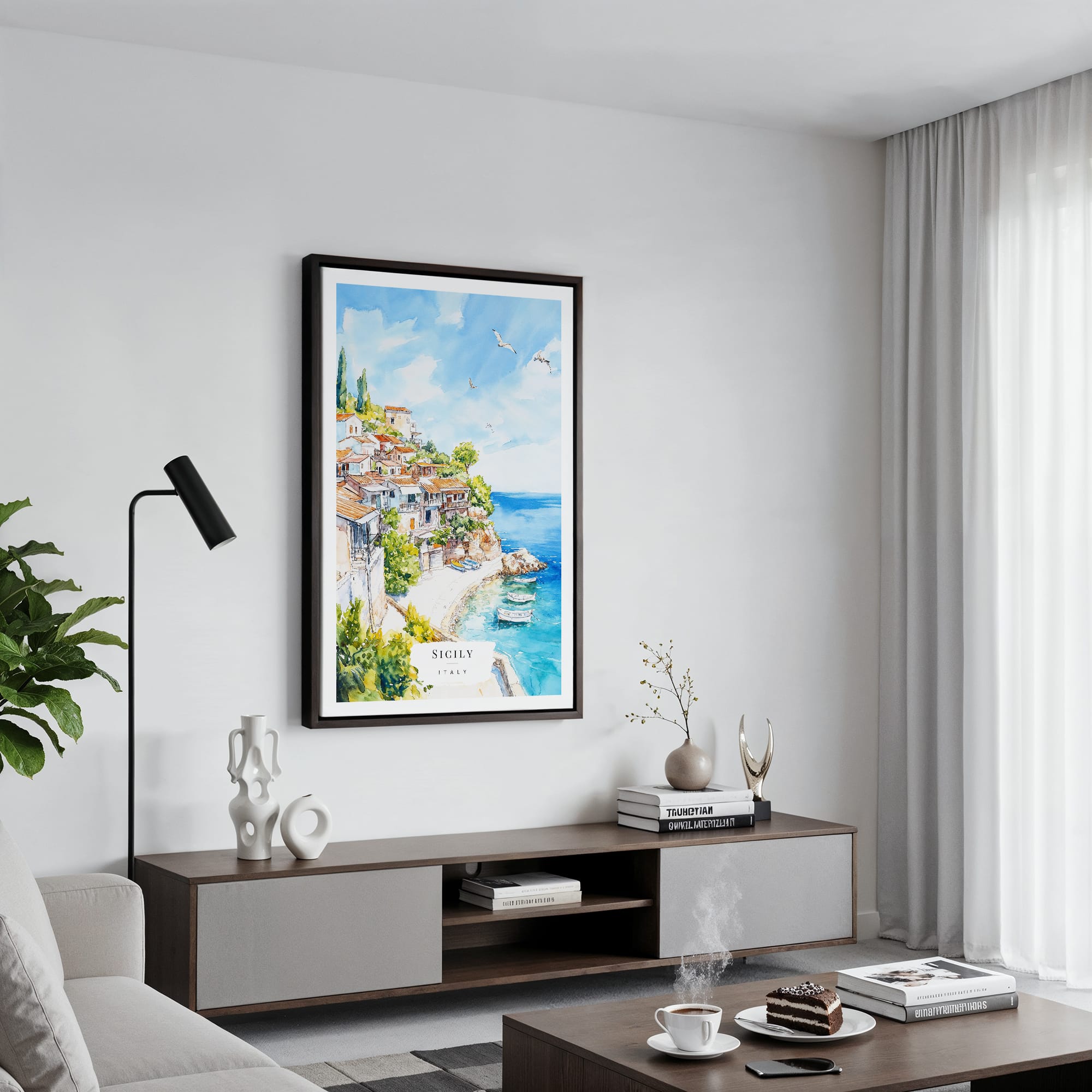 Sicily Italy Watercolor Canvas Print – Coastal Village Scene Wall Art