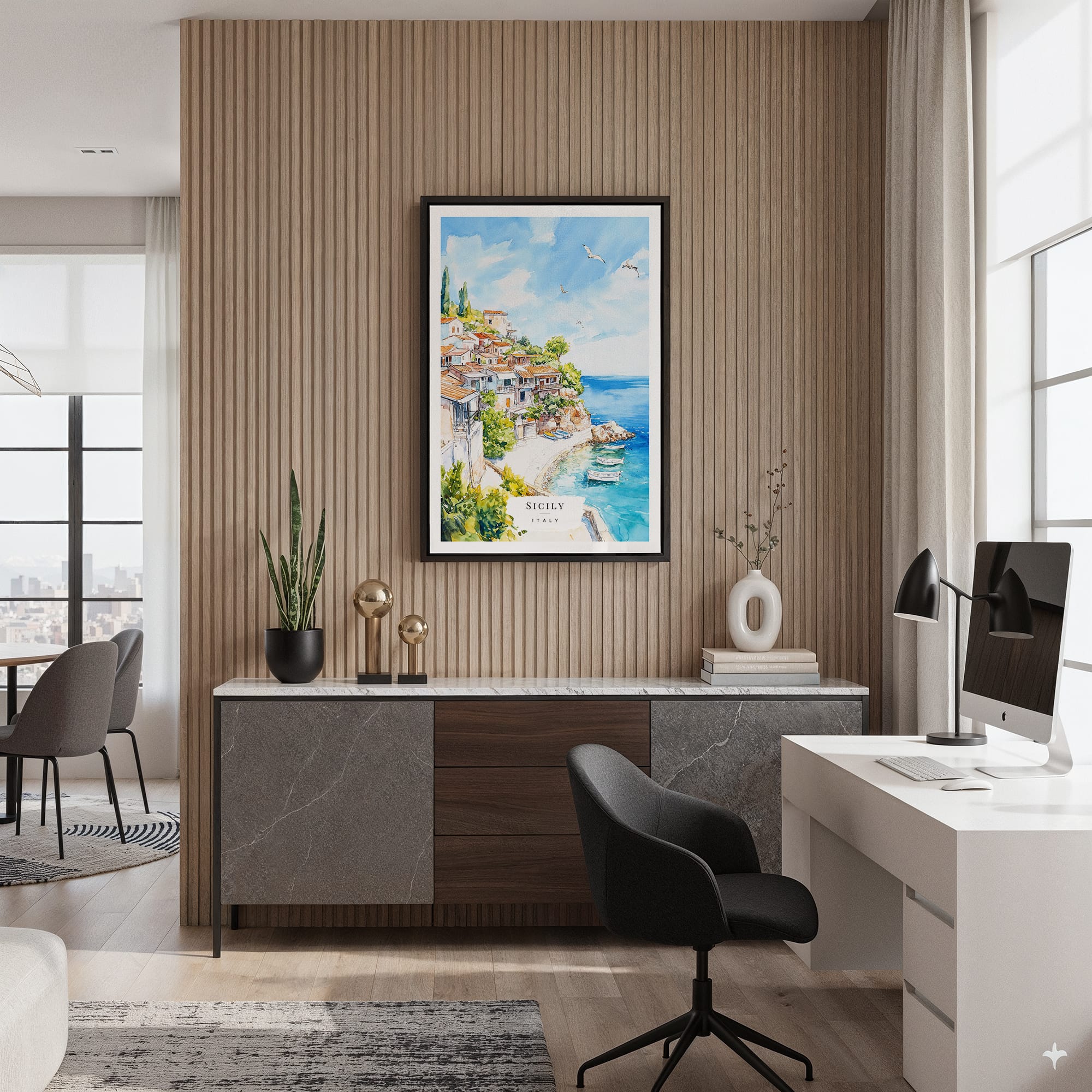 This artwork captures the serene beauty of a coastal village in Sicily, showcasing vivid blues and lush greens that evoke a relaxing Mediterranean atmosphere. It’s printed on high-quality canvas with fade-resistant inks, ensuring long-lasting colors and a matte finish that complements any decor. Perfect for living rooms, bedrooms, or offices, this piece brings a touch of Italy to your space. Enjoy it yourself or share the charm as a gift for those who appreciate travel and culture.