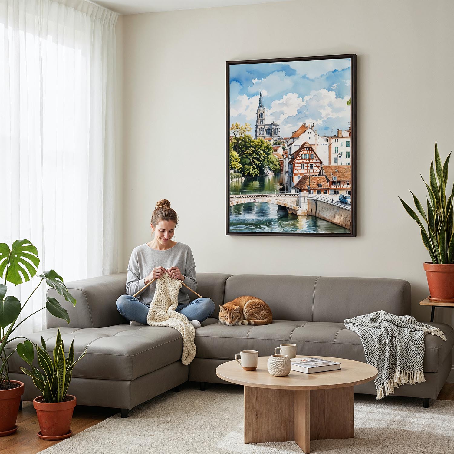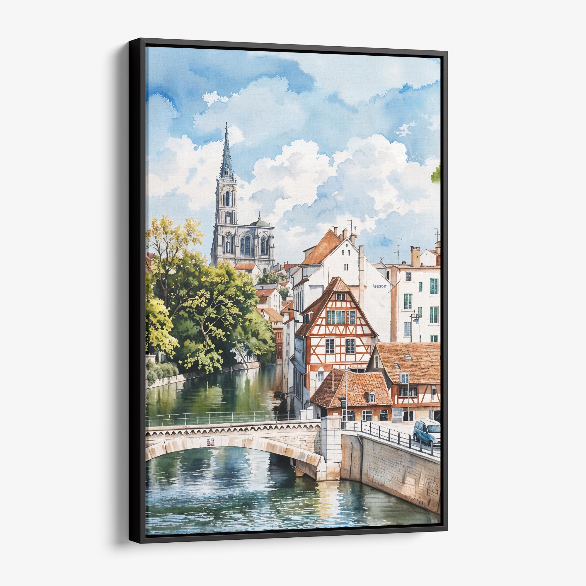 Experience the essence of Strasbourg with this stunning watercolor canvas print. Capturing the vibrant architecture and serene waterways, it offers a glimpse into the city’s unique beauty and lively atmosphere. This artwork is available in various finishes, including unframed and floater frame options.