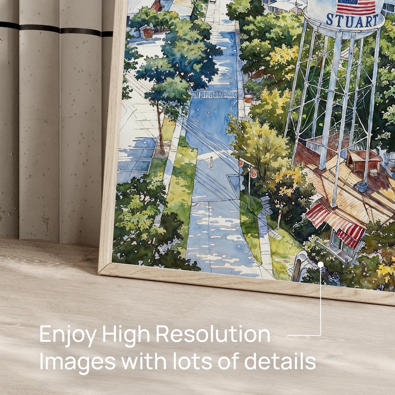 Experience the essence of Stuart, Florida, with this beautifully illustrated watercolor print. The artwork showcases the town’s quaint architecture, vibrant greenery, and coastal views, inviting a sense of relaxation and warmth.