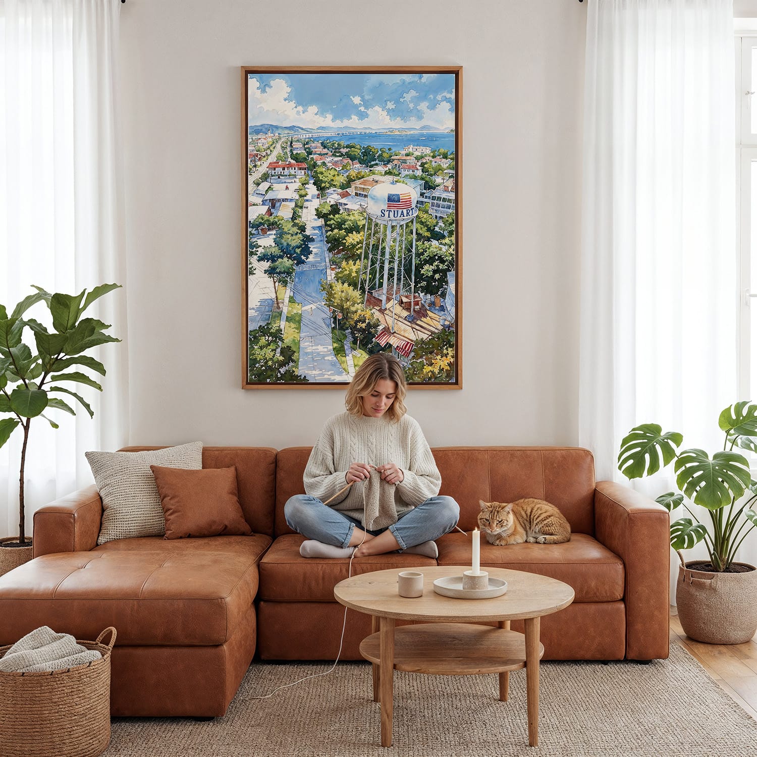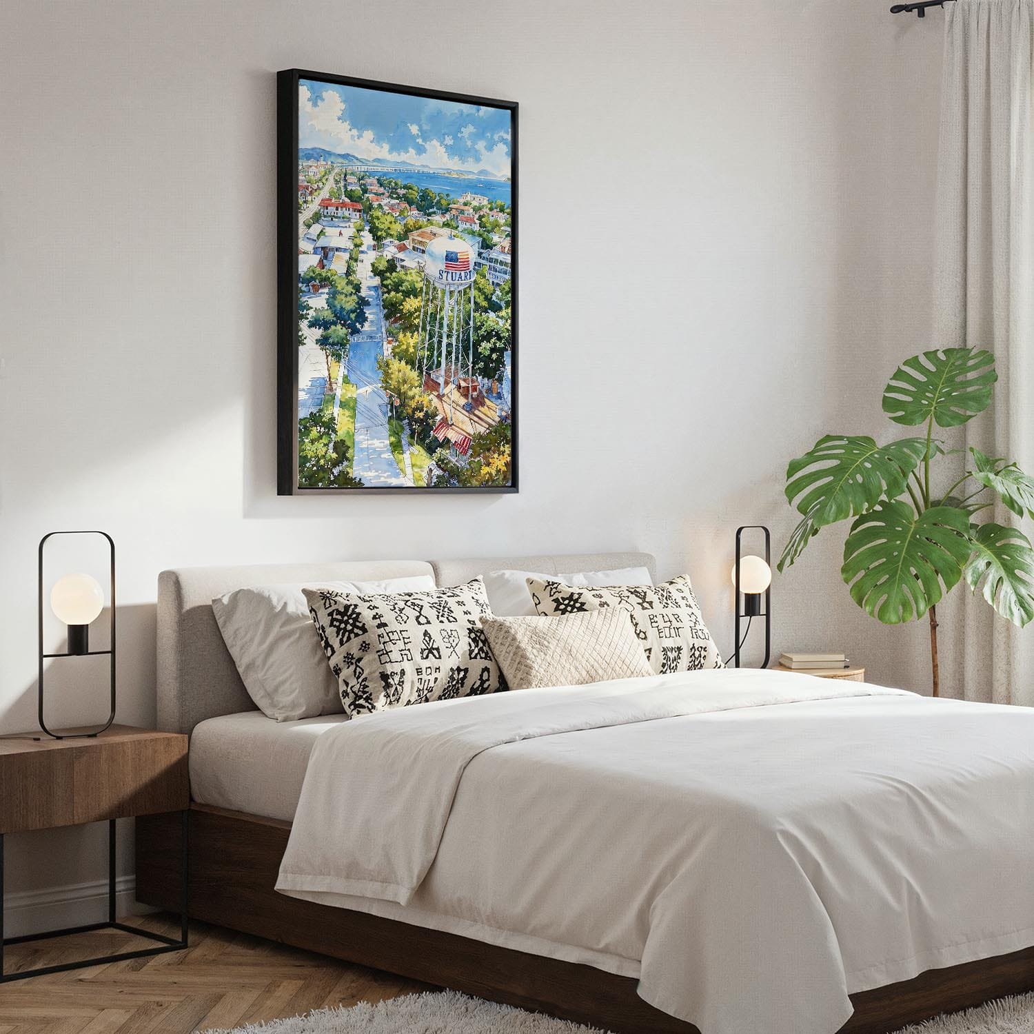 Discover the charm of Stuart, Florida, captured beautifully in this watercolor canvas print. Featuring the iconic water tower amidst lush greenery and coastal views, this artwork evokes a warm, inviting atmosphere reminiscent of sunny days by the water.